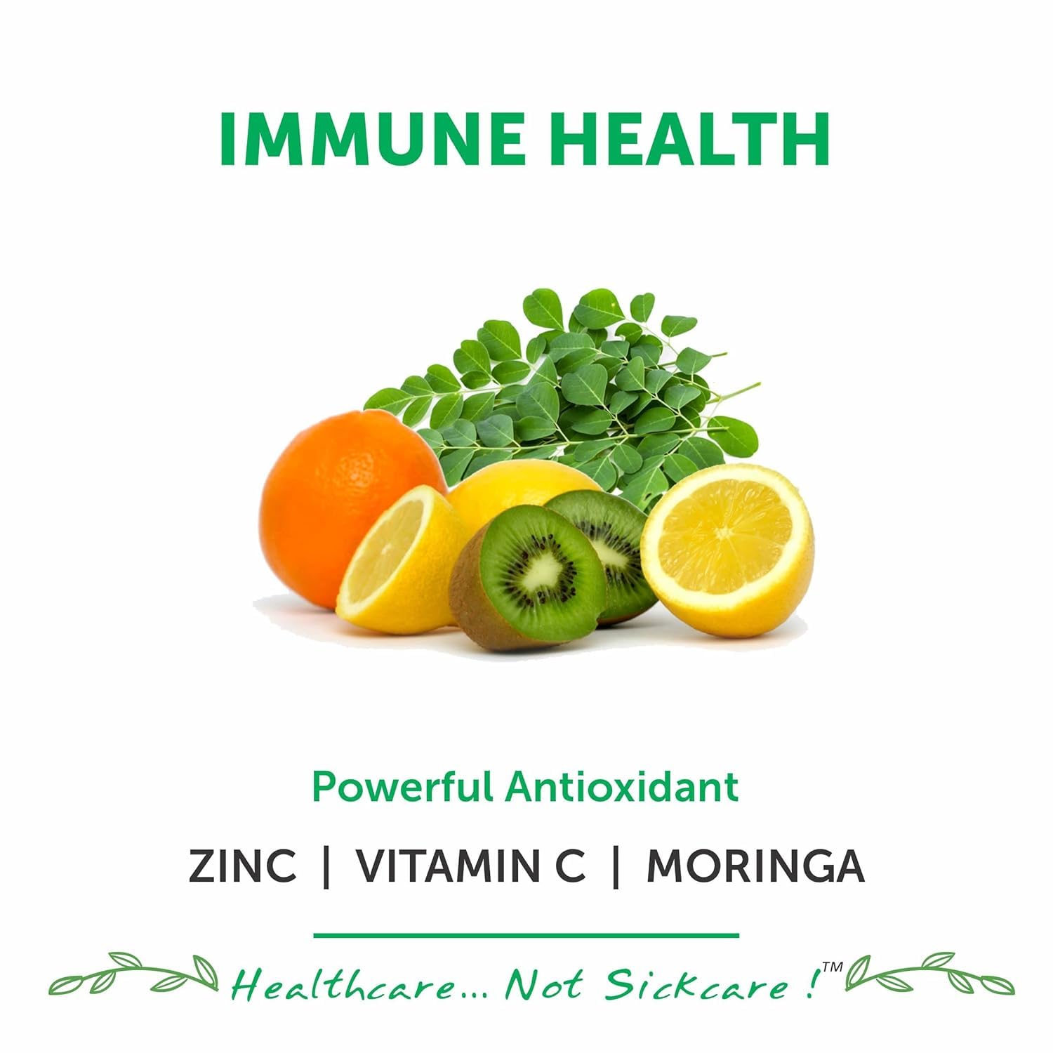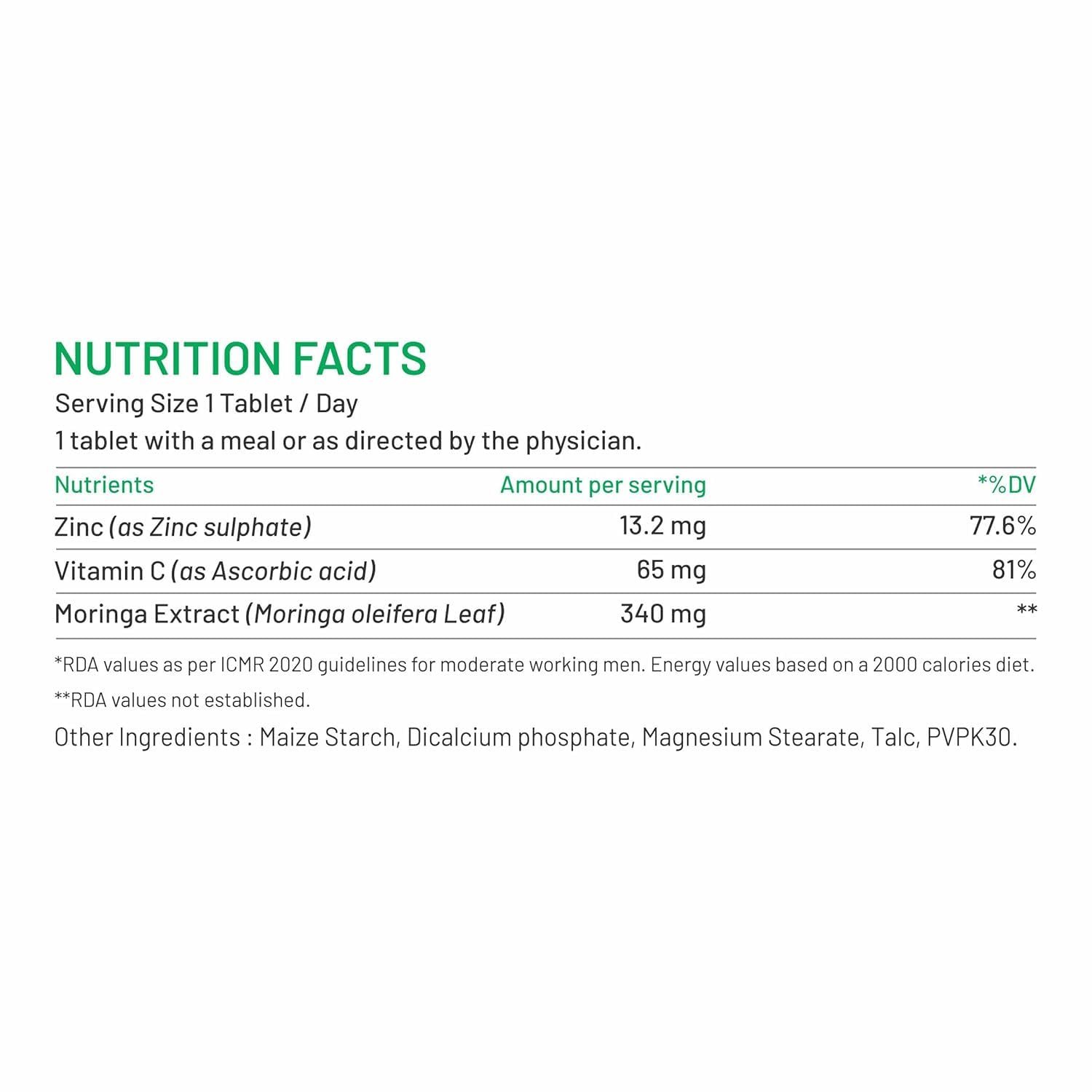 IMMUNITY BOOSTER : This unique combination of Vitamin C Zinc & Moringa helps strengthen the development and functioning of the T cells responsible for maintaining a healthy Immune system.