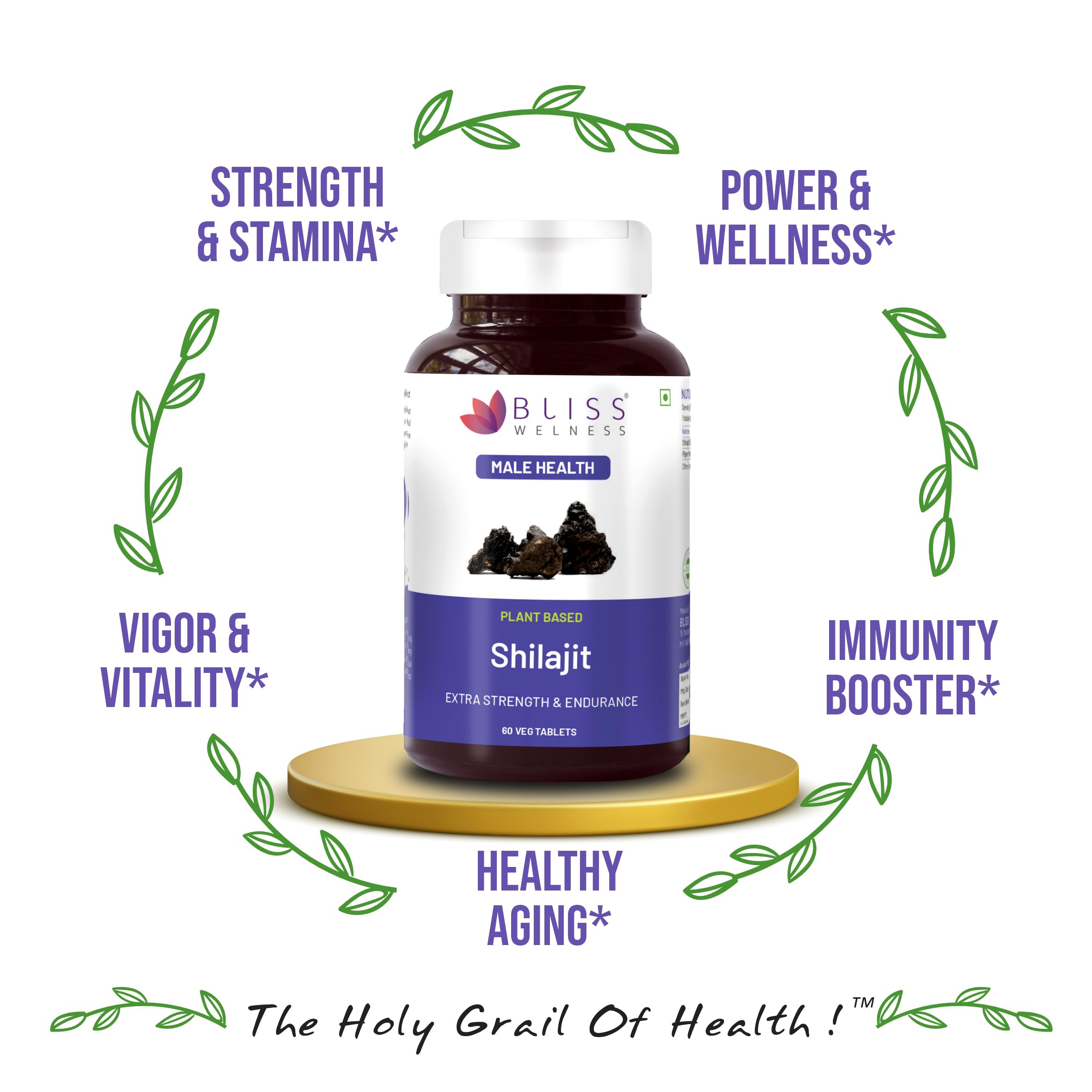 Bliss Welness Pure Himalayan Shilajit Extract | Shuddh Shilajeet 1000mg | Enhanced Stamina Power Strength Vitality Vigor & Endurance Performance Booster Ayurvedic Herbal Supplement - 60 Veg Tablets