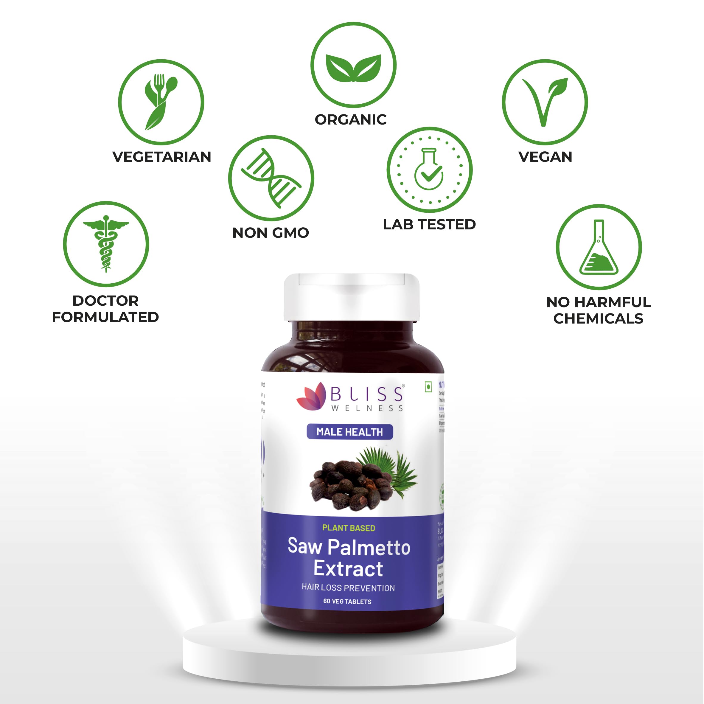 STRONG & SHINY HAIR : Bliss Welness Saw Palmetto Extract helps maitain healthy levels of DHT by balancing hormone levels to combat hair loss. It helps strengthen hair follicles & improves hair growth strength and density.