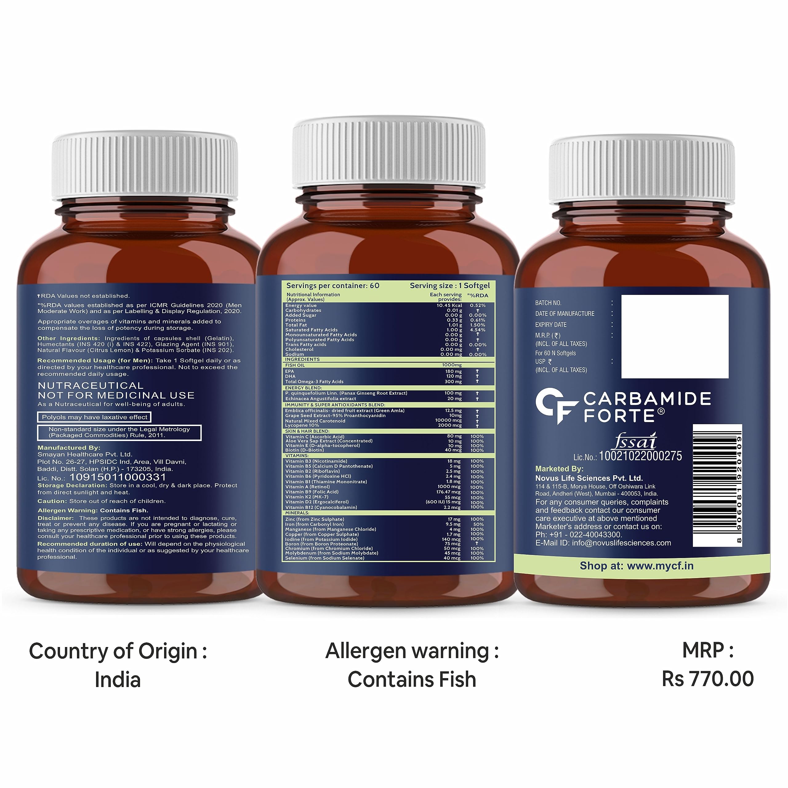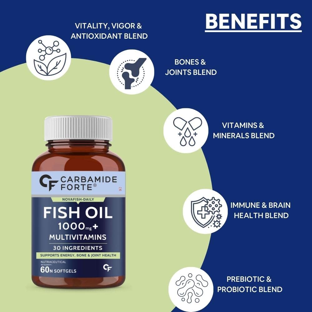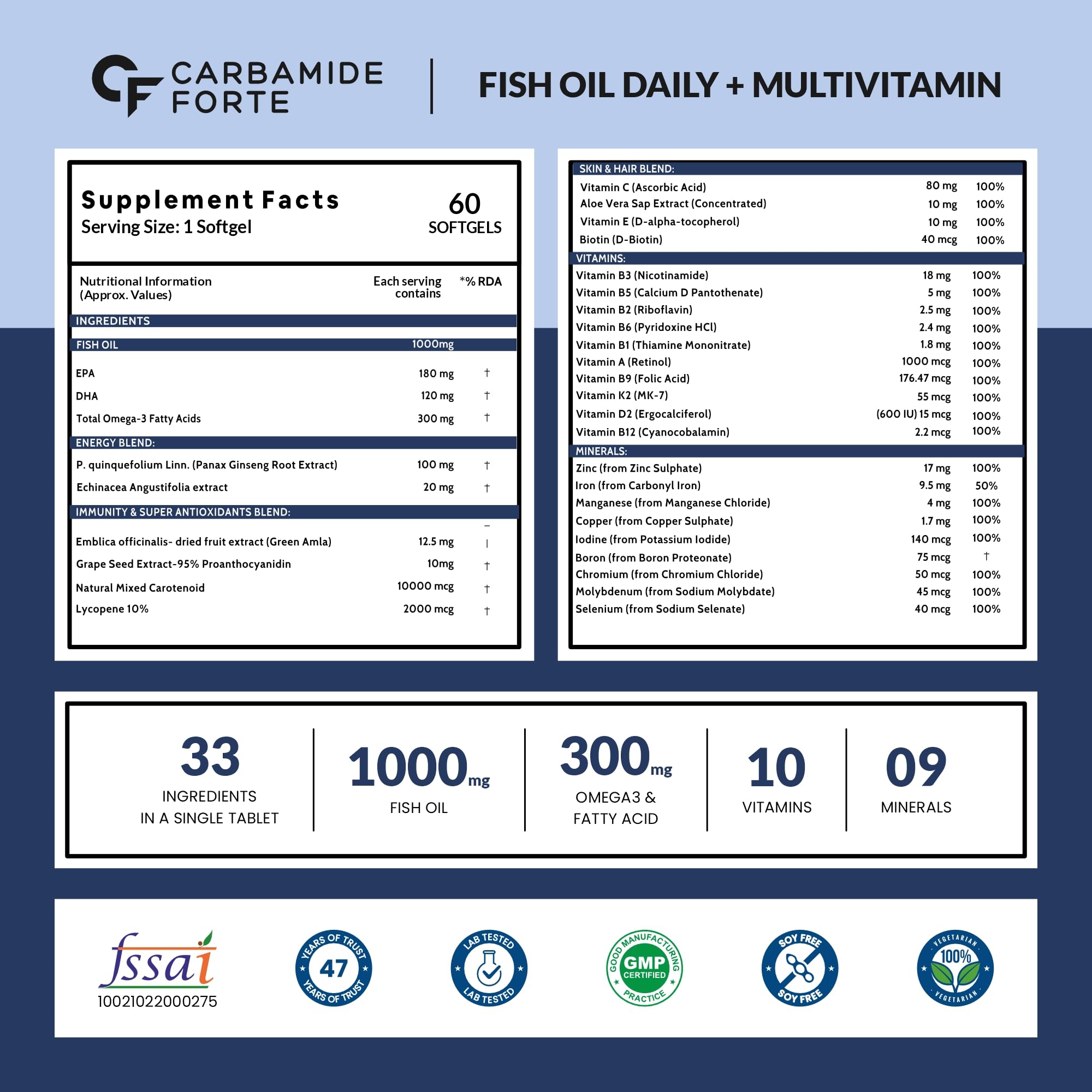 Carbamide Forte Fish Oil with Multivitamin and Omega 3 1000mg Capsules for Men & Women | Fish Oil And Multivitamin Combo with 30 Ingredients - 60 Softgel Capsules