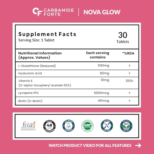 Carbamide Forte Japanese Reduced L Glutathione 500mg Tablets For Skin Whitening | L Glutathione with Hyaluronic Acid Vitamin E Lycopene & Biotinâ 30 Veg Tablets