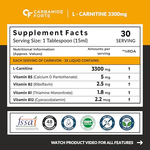 HomeHealth & PersonalDiet & NutritionHealth SupplementsCarbamide Forte L Carnitine Liquid 3300mg | L-Carnitine Supplement For Men & Women | Liquid L Carnitine Pre Workout, Intra Workout & Post Workout Supplement With 3300 mg Per Serving With Added Vitamins | L’Carnitine Mango Flavour With 30 Servings - 450ml