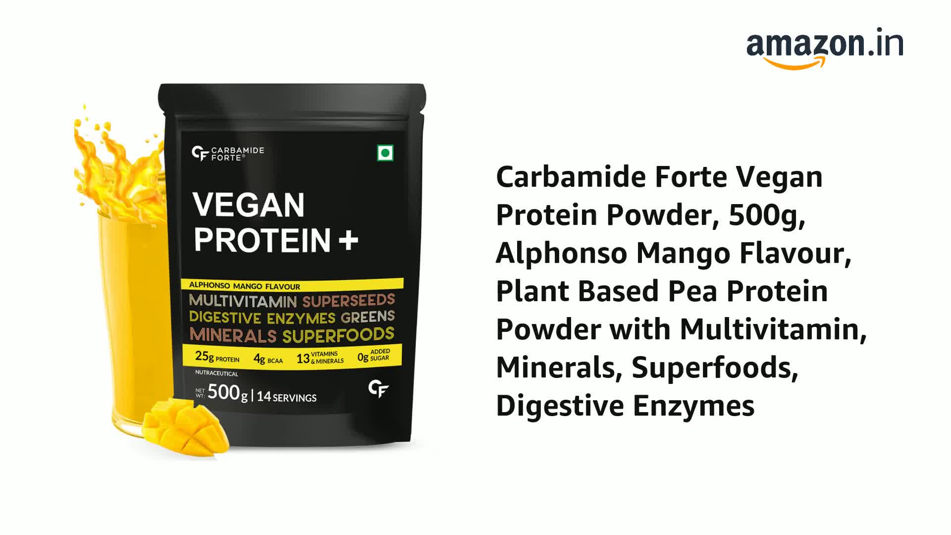 HomeHealth & PersonalDiet & NutritionHealth SupplementsCarbamide Forte Vegan Protein Powder - Plant Based Protein Powder with Multivitamin, Minerals, Superfoods, Pea Protein, Digestive Enzymes | Plant Protein Powder - Alphonso Mango Flavour - 500g