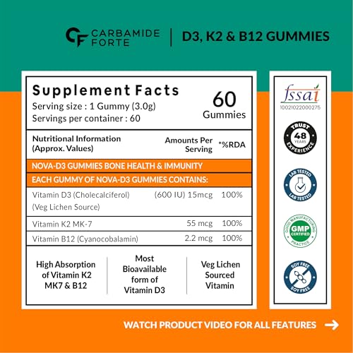 VEG CHOLECALCIFEROL THE BEST ABSORBED FOR VITAMIN D SUPPLEMENT: Vitamin D3 + K2 + B12 Gummies contain Veg Lichen source Cholecalciferol which has max absorption. Stabilised Vitamin D3 supplement ensures highest potency.