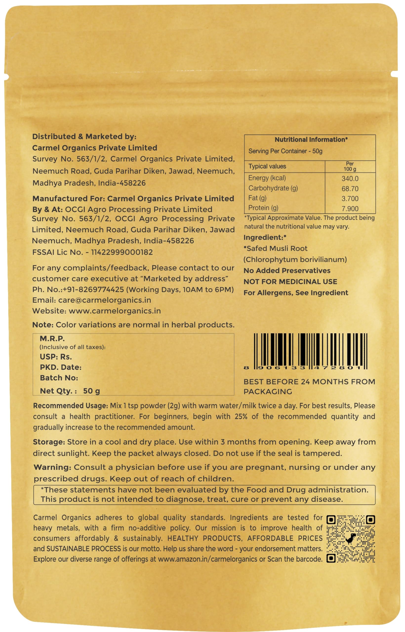 CARMEL ORGANICS Safed Musli Root 50 Grams | Natural | Non-GMO | Siva Musli Podi/Shweta Musli | Chlorophytum Borivilianum | No Added Preservatives