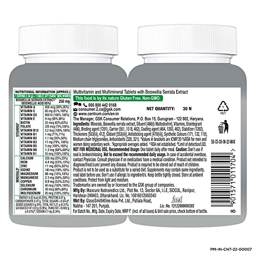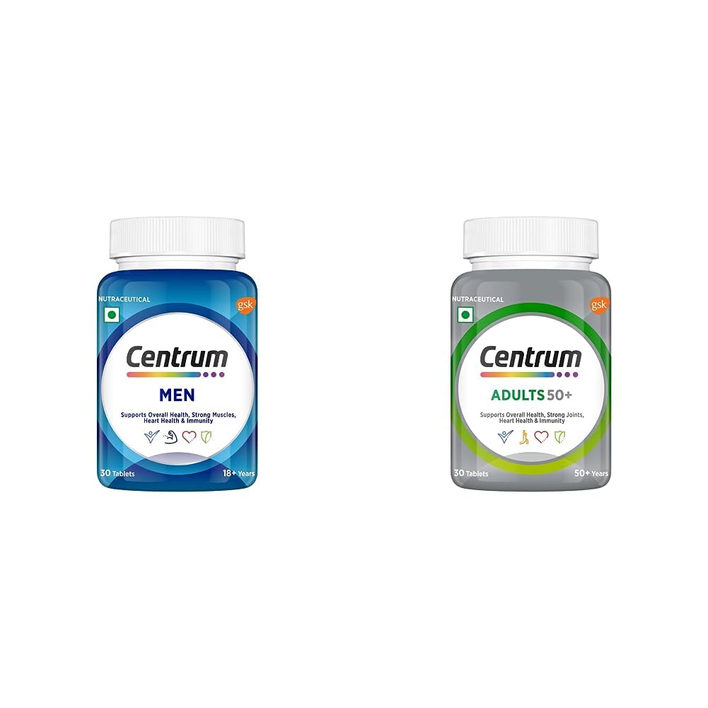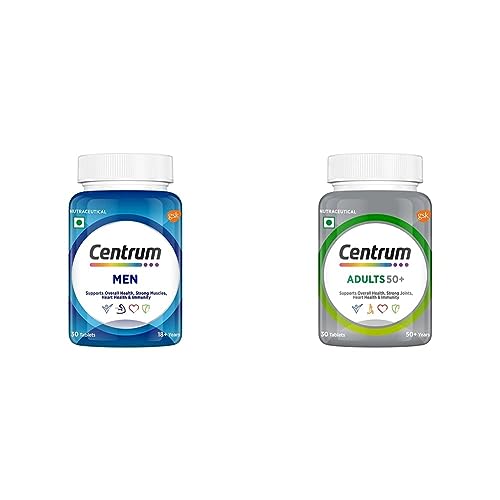Centrum Men Tablet World's No.1 Multivitamin with Grape seed extract Vitamin C & 21 other nutrients for Overall Health Strong Muscles & Immunity (Veg) 30sCentrum is World's no. 1 Multivitamin and Multimineral brand that is present globally across 7 continents and is now in India. Centrum Men is a daily nutritional supplement to meet your modern-day nutrition needs so you can feel confident that your body can keep up with your demanding multi-life. Your daily supplement is formulated with 23 essential Vitamins and Minerals. Centrum formulations have been tailormade for Indian diets & body needs. Its comprehensive formula ensures overall health. The Immune support nutrients such as Vitamin C and Zinc enhances Immunity and helps in fighting off infections. The formulation contains blend of B Vitamins Calcium and Magnesium that ensures muscle performance and also helps in strengthening of bones. Centrum Men is fortified with Botanical Blend of Grape Seed Extract to ensure healthy heart. Centrum Tablets are 100% vegetarian & suitable to consume for Vegans as well. These are Gluten free tablets with Non GMO. Don't worry they are non habit forming. Centrum Multivitamin supplements are manufactured in a FSSAI certified facility that is GMP certified. Centrum is completely FSSAI Compliant. You can refer pack for correct dosage and administration or can consult your health care practioner. For storage condition please refer the pack.Centrum Adult 50+ World's No.1 Multivitamin with Calcium Vitamin D3 & 21 other Nutrients for Overall Health Strong Joints & Heart Health (Veg) 30 TabletsCentrum is World's no. 1 Multivitamin and Multimineral brand that is present globally across 7 continents and is now in India. Getting older doesn't mean you have to slow down but it may mean you need to adjust your nutrient levels to respond to your body's changing needs. Centrum Adult 50+ Multivitamin & Multimineral Supplement is a daily nutritional supplement to stay active and healthy so you can feel confident that your body can keep up with your life. Centrum formulations have been tailormade for Indian diets & body needs. It's comprehensive formula with 23 vital nutrients that ensures over all health. Vitamin C and Zinc enhances Immunity. Vitamin C Vitamin E and B Vitamins for Healthy Heart and a Botanical Blend of Boswellia Serrata with Calcium & Vitamin D to ensure healthy functioning Joints. Centrum Tablets are 100% vegetarian & suitable to consume for Vegans as well. These are Gluten free tablets with Non GMO. Don't worry they are non habit forming. Centrum Multivitamin supplements are manufactured in a FSSAI certified facility that is GMP certified. Centrum is completely FSSAI complaint. You can refer pack for correct dosage and administration or can consult your health care practioner. For storage condition please refer the pack.