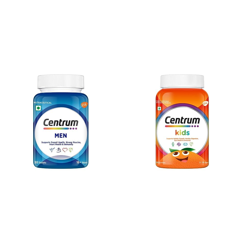 Centrum Men Tablet World's No.1 Multivitamin with Grape seed extract Vitamin C & 21 other nutrients for Overall Health Strong Muscles & Immunity (Veg) 30sCentrum is World's no. 1 Multivitamin and Multimineral brand that is present globally across 7 continents and is now in India. Centrum Men is a daily nutritional supplement to meet your modern-day nutrition needs so you can feel confident that your body can keep up with your demanding multi-life. Your daily supplement is formulated with 23 essential Vitamins and Minerals. Centrum formulations have been tailormade for Indian diets & body needs. Its comprehensive formula ensures overall health. The Immune support nutrients such as Vitamin C and Zinc enhances Immunity and helps in fighting off infections. The formulation contains blend of B Vitamins Calcium and Magnesium that ensures muscle performance and also helps in strengthening of bones. Centrum Men is fortified with Botanical Blend of Grape Seed Extract to ensure healthy heart. Centrum Tablets are 100% vegetarian & suitable to consume for Vegans as well. These are Gluten free tablets with Non GMO. Don't worry they are non habit forming. Centrum Multivitamin supplements are manufactured in a FSSAI certified facility that is GMP certified. Centrum is completely FSSAI Compliant. You can refer pack for correct dosage and administration or can consult your health care practioner. For storage condition please refer the pack.Centrum Kids World's No.1 Multivitamin with Probiotics Vitamin C & 11 other nutrients for Immunity Healthy Digestion & Eye Health (Veg)- 30 GummiesCentrum is World's no. 1 Multivitamin and Multimineral brand that is present across 7 continents and is now in India. Centrum Kids Multivitamin and Mineral with Probiotic gummies is designed to meet the special needs of growing children in terms of vitamin and mineral intake from the age of five. Centrum Kids Multi-Gummies is a daily nutritional supplement in a tasty gummy format that kids will love while you can feel confident that their body can support their potential. Centrum Kids Multivitamin and Mineral with Probiotics is formulated with 13 essential nutrients to support Healthy growth. Centrum formulations have been tailormade for Indian diets & body needs. It is fortified with Probiotic Bacillus Coagulans for gut health that aids digestion. It contains Immune support nutrients such as Vitamin C and Zinc to aid immunity. It supports immune system to fight off infections. Centrum Gummies are 100% vegetarian. It is suitable to be consumed by Vegans as well. These are Gluten free gummies and are Non GMO. Don't worry they are non habit forming. Centrum Multivitamin supplements are manufactured in a FSSAI certified facility that is GMP certified. These daily multivitamin gummies are FSSAI complaint. You can refer pack for correct dosage and administration or consult your health care practioner. For storage condition please refer the pack.