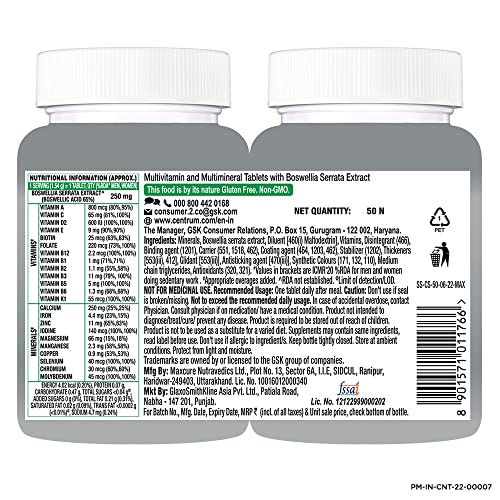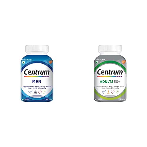 Centrum Adult 50+ World's No.1 Multivitamin with Calcium Vitamin D3 & 21 other Nutrients for Overall Health Strong Joints & Heart Health (Veg) 50 TabletsCentrum is World's no. 1 Multivitamin and Multimineral brand that is present globally across 7 continents and is now in India. Getting older doesn't mean you have to slow down but it may mean you need to adjust your nutrient levels to respond to your body's changing needs. Centrum Adult 50+ Multivitamin & Multimineral Supplement is a daily nutritional supplement to stay active and healthy so you can feel confident that your body can keep up with your life. Centrum formulations have been tailormade for Indian diets & body needs. It's comprehensive formula with 23 vital nutrients that ensures over all health. Vitamin C and Zinc enhances Immunity. Vitamin C Vitamin E and B Vitamins for Healthy Heart and a Botanical Blend of Boswellia Serrata with Calcium & Vitamin D to ensure healthy functioning Joints. Centrum Tablets are 100% vegetarian & suitable to consume for Vegans as well. These are Gluten free tablets with Non GMO. Don't worry they are non habit forming. Centrum Multivitamin supplements are manufactured in a FSSAI certified facility that is GMP certified. Centrum is completely FSSAI complaint. You can refer pack for correct dosage and administration or can consult your health care practioner. For storage condition please refer the pack.Centrum Men World's No.1 Multivitamin with Grape seed extract Vitamin C & 21 other nutrients for Overall Health Strong Muscles & Immunity (Veg) 50sCentrum is World's no. 1 Multivitamin and Multimineral brand that is present globally across 7 continents and is now in India. Centrum Men is a daily nutritional supplement to meet your modern-day nutrition needs so you can feel confident that your body can keep up with your demanding multi-life. Your daily supplement is formulated with 23 essential Vitamins and Minerals. Centrum formulations have been tailormade for Indian diets & body needs. Its comprehensive formula ensures overall health. The Immune support nutrients such as Vitamin C and Zinc enhances Immunity and helps in fighting off infections. The formulation contains blend of B Vitamins Calcium and Magnesium that ensures muscle performance and also helps in strengthening of bones. Centrum Men is fortified with Botanical Blend of Grape Seed Extract to ensure healthy heart. Centrum Tablets are 100% vegetarian & suitable to consume for Vegans as well. These are Gluten free tablets with Non GMO. Don't worry they are non habit forming. Centrum Multivitamin supplements are manufactured in a FSSAI certified facility that is GMP certified. Centrum is completely FSSAI Compliant. You can refer pack for correct dosage and administration or can consult your health care practioner. For storage condition please refer the pack.
