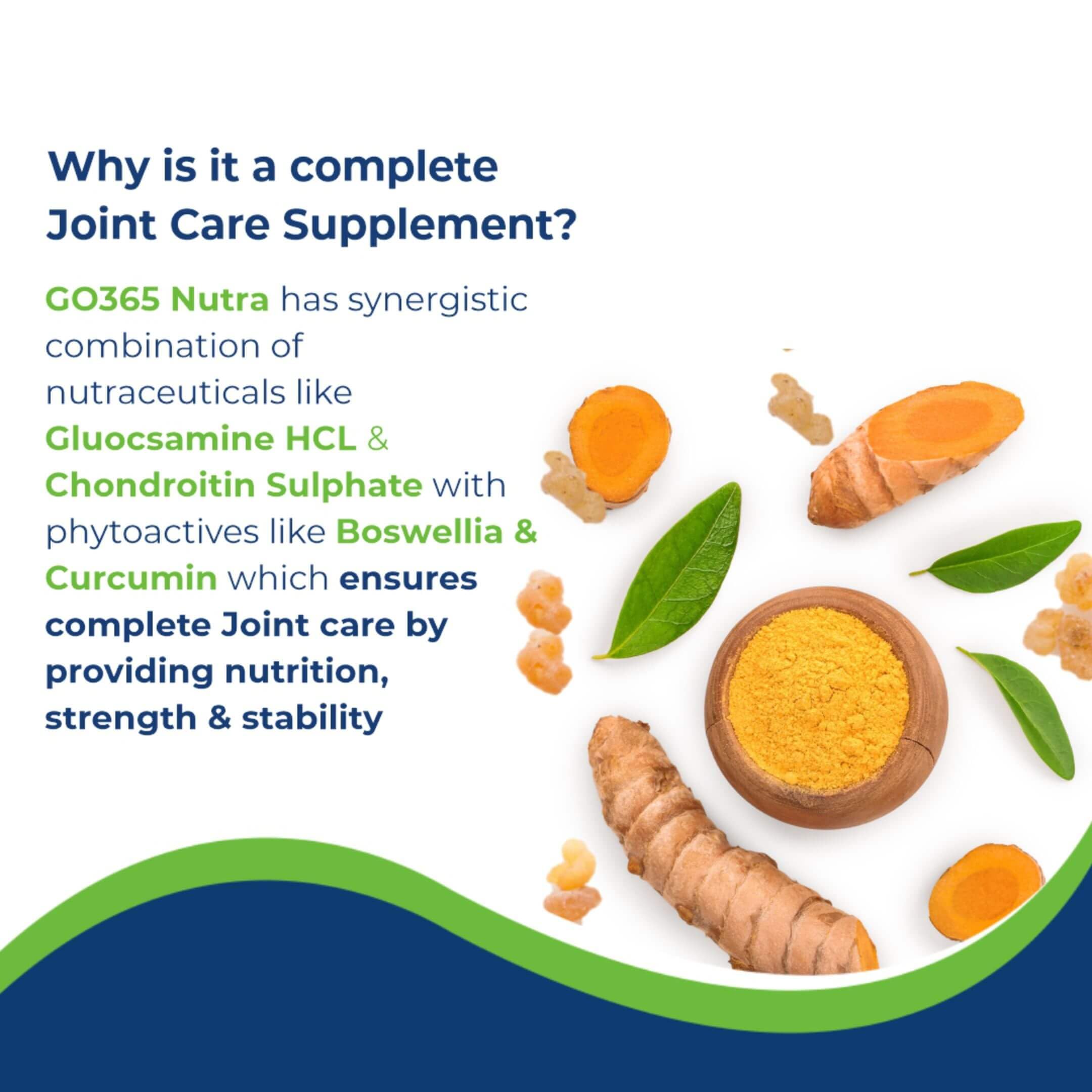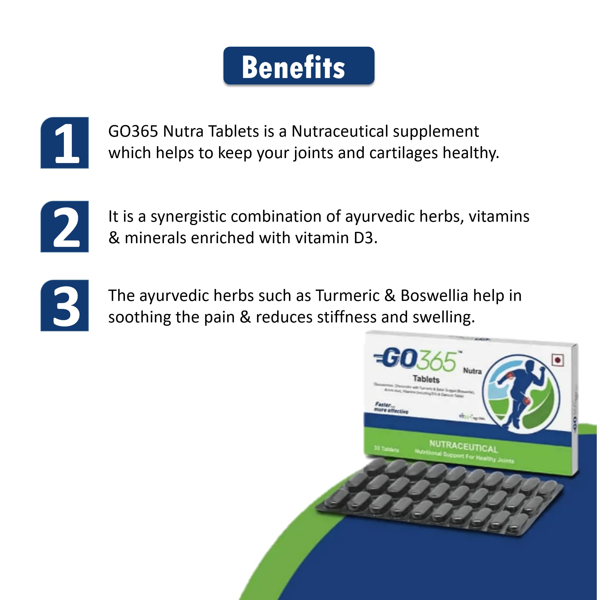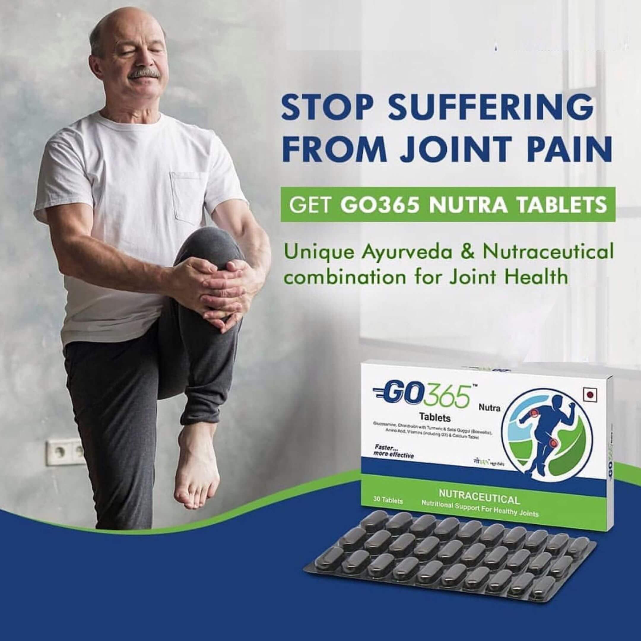 Nutraceutical Supplement for Joints! Go365 Nutra Tablet is an Ayurvedic formula in combination with nutraceuticals like glucosamine and chondroitin to helps in improve and restore joint health.