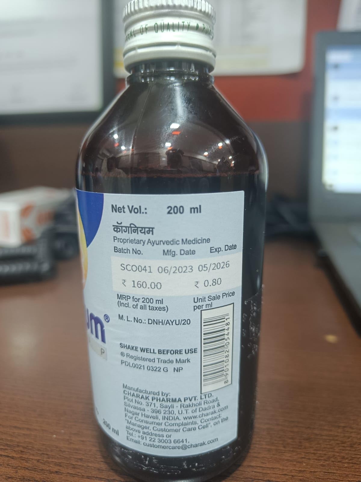 Ingredients: brahmi (100 mg) jala-brahmi (70 mg) arjun chhal (70 mg) shankhapushpi (70 mg) ashwgandha (70 mg) jyotishmati (50 mg) vaj (50 mg) yashtimadhu (50 mg) saunf (25 mg) jaiphal (20 mg) sugar (3000 mg) sodium benzoate (25 mg) sodium methyl paraben (10 mg) sodium propyl paraben (1 mg) citric acid monohydrate (q.s) flavour strawberry (25 mg).