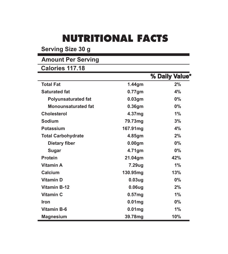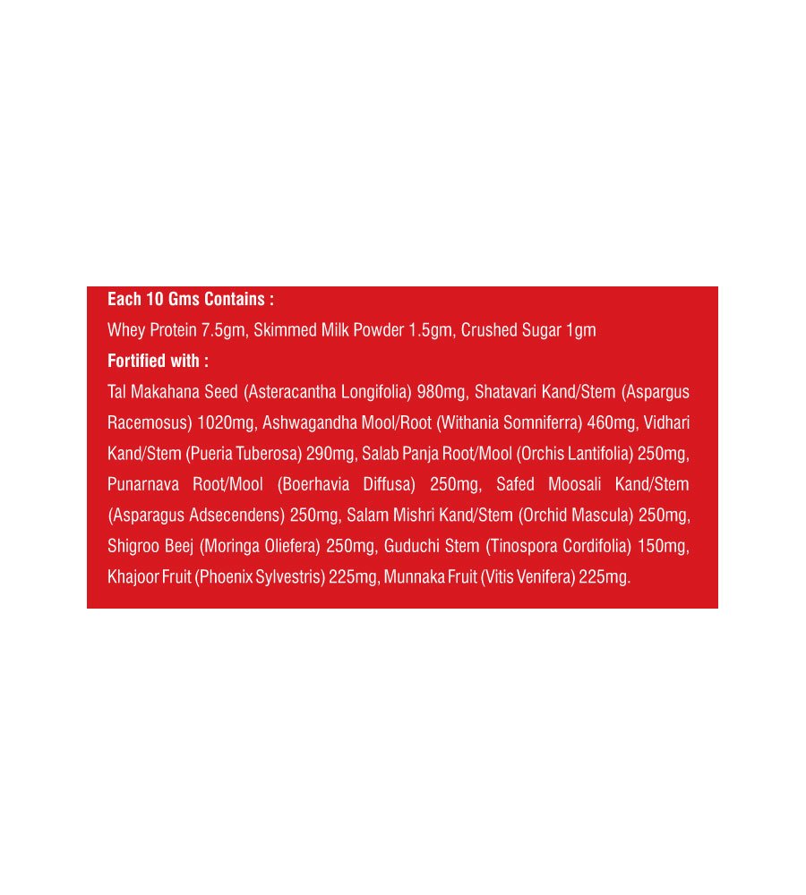 Ingredients (each 10 gms): whey protein 7.5 gm skimmed milk powder 1.5 gm crushed sugar 1.5 gm. Fortified with: tal makahana(asteracantha longifolia) 980 mg shatavari(asparagus racemosus) 1020 mg ashwagandha(withania somniferra) 460 mg vidhari kand(pueria tuberosa) 290 mg salab panja(orchis lantifolia) 250 mg punarnava(boerhavia diffuse) 250 mg safed moosali(asparagus adsecendens) 250 mg salam mishri(orchid mascula) 250 mg shigroo beej(moringa oliefera) 250 mg guduchi(tinospora cordifolia) 150 mg khajoor(phoenix sylvestris) 225 mg munnaka(vitis venifera) 225 mg.