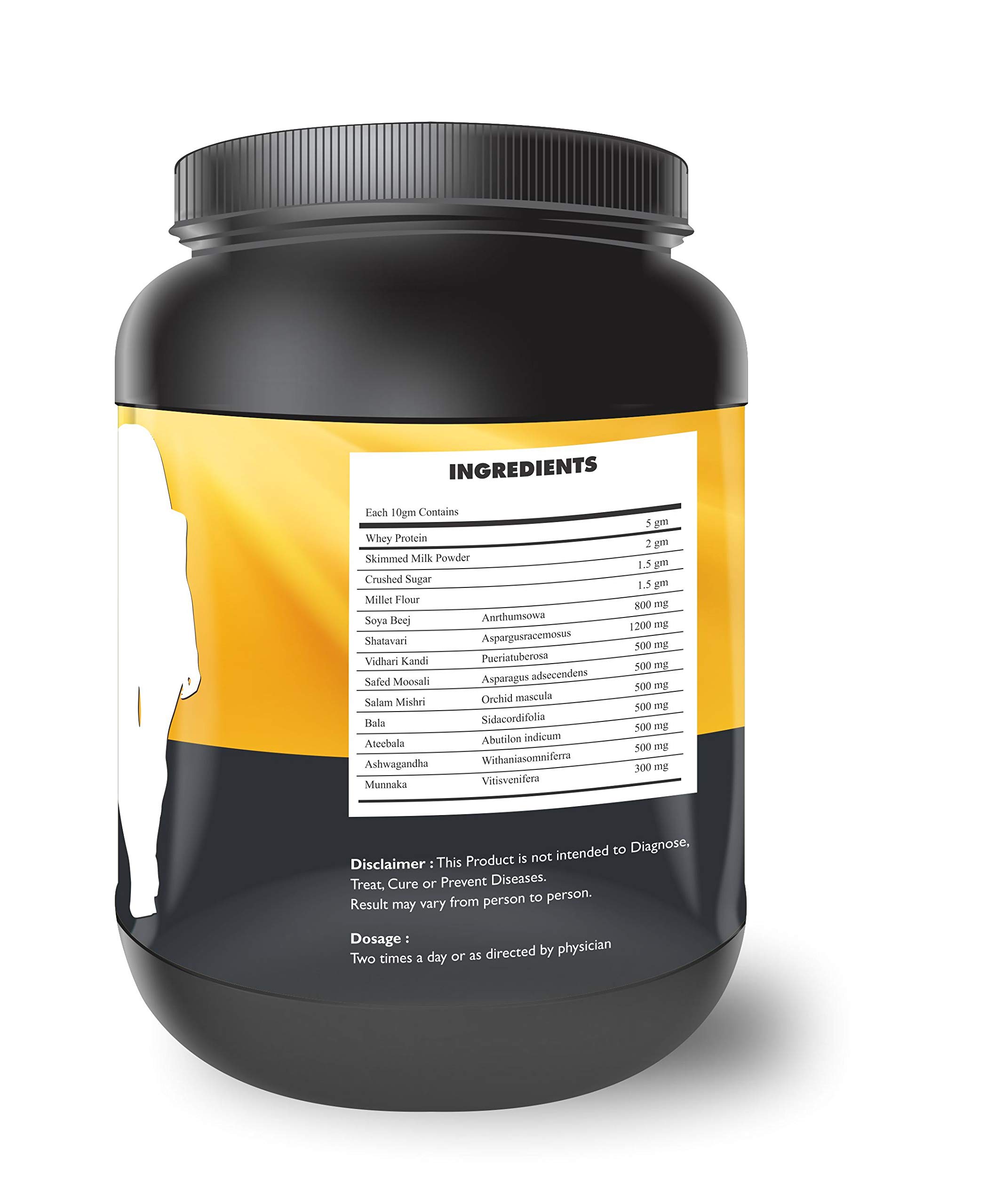 Ingredients (each 10 gms): whey protein 5 gm skimmed milk powder 2 gm crushed sugar 1.5 gm millet flour 1.5 with: soya beej(anrthum sowa) 800 mg shatavari(asparagus racemosus) 1200 mg vidhari kandi(pueria tuberosa) 500 mg safed moosali(asparagus adsecendens) 500 mg salam mishri(orchid mascula) 500 mg bala(sida cordifolia) 500 mg ateebala(abutilon indicum) 500 mg ashwagandha(withania somniferra) 500 mg munnaka(vitis venifera) 300 mg.