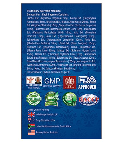 Composition (each capsule contains): jaiphal 5 mg loung 5 mg bhringraj 20 mg sonth 10 mg sarpunkha 10 mg punernava 10 mg malkangani 10 mg arlu 10 mg jarul 10 mg talmakhana 10 mg amla 10 mg pipal 10 mg shatavar 10 mg nagkeshar 15 mg makoy 15 mg chitrak 15 mg arandkakdi 15 mg barahikand 20 mg safed musli 20 mg ashwagandha 50 mg vidarikand 80 mg konch 90 mg.