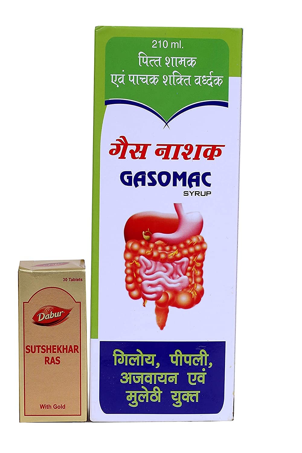 Ayurvedic Product. Contains 1 Pc. Sutshekhar Rasa Gold 30 Tablets And Gasomac 200 ml. Useful In HyperacidityMigrain And Vomiting SOOTASHEKHAR RAS by DABUR is a herbo-mineral product which is more potensified with Gold and is extensively used. It acts very well on digestive system problems. INDICATIONS: Indicated in acidity burning sensation in throat and chest headache and vomiting. DOSAGE: As prescribed by the physician.