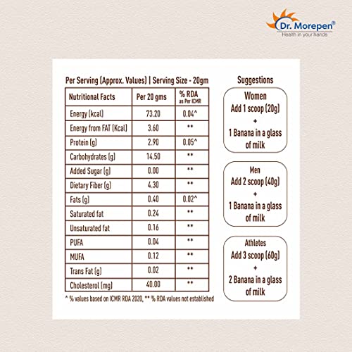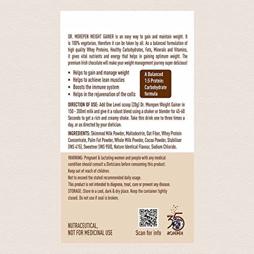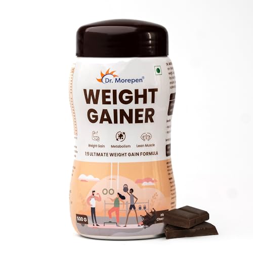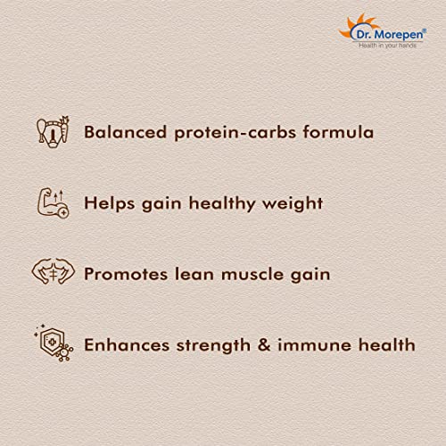 1:5 PROTEIN CARBS FORMULA FOR HEALTHY WEIGHT GAIN Dr. Morepen Weight Gainer supports mass gaining goals with its high-quality carbs and protein content. It is ideal for people struggling to meet daily calorie intake in order to gain weight. This supplemen