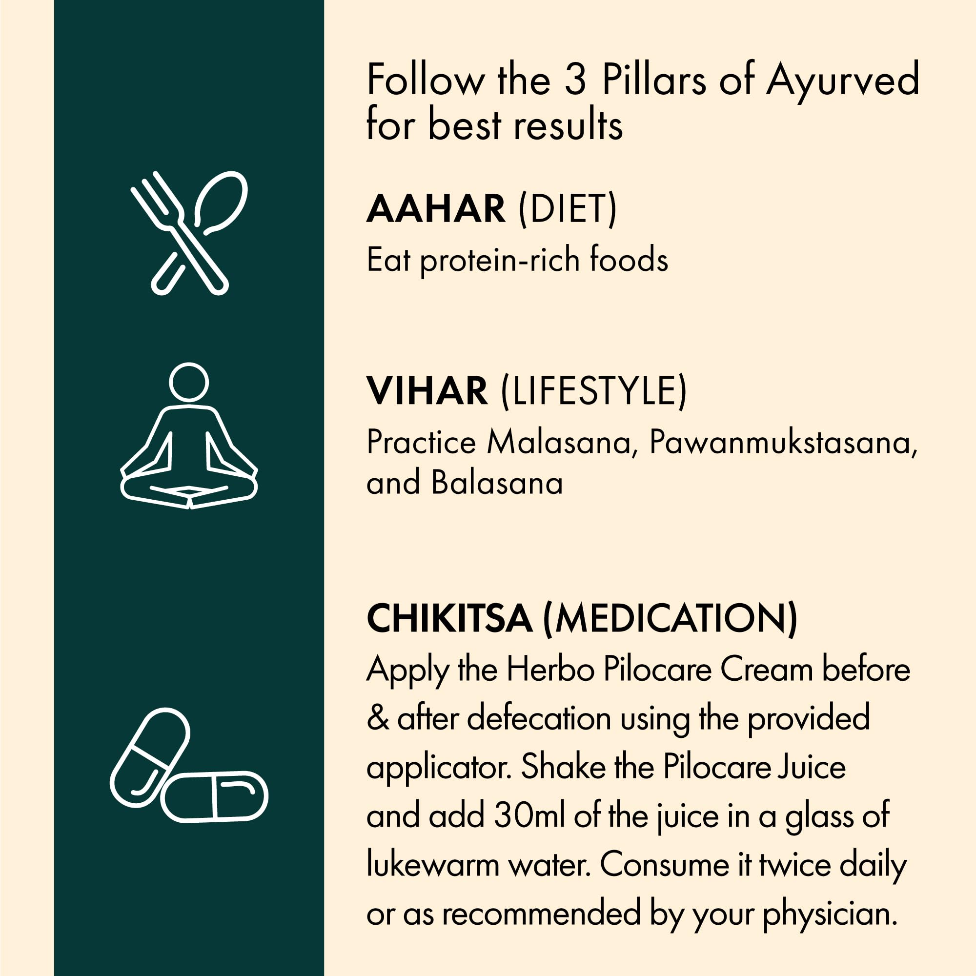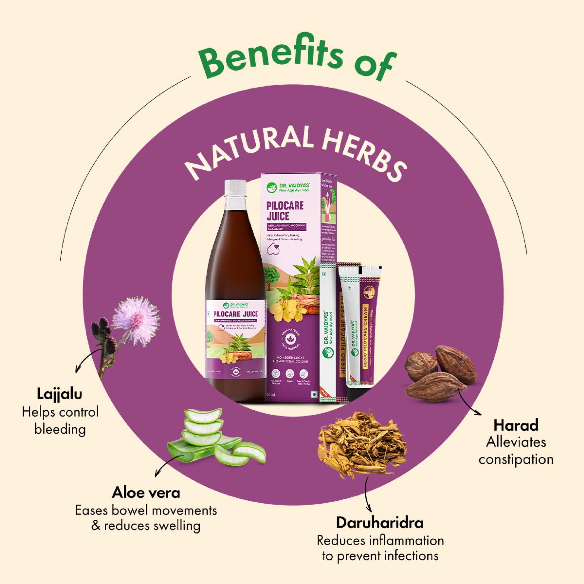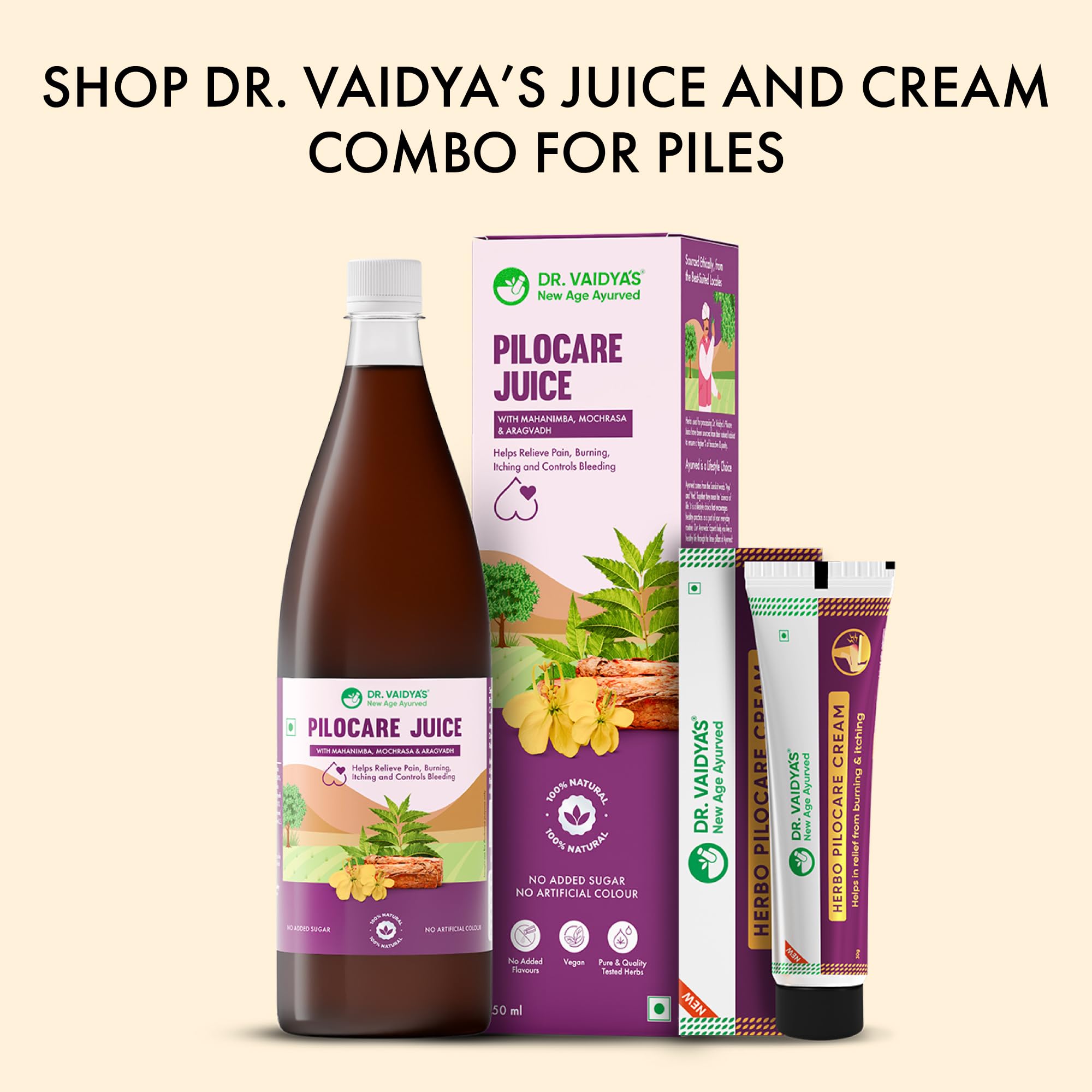 Want to get effective relief from piles pain and its mild symptoms? Bring home Piles Care Combo that consists of Piles Care Juice and Herbo Pilocare Cream. It is the ultimate Ayurvedic solution for piles relief. The piles care combo contains super herbs like Lajjalu Daruharidra and Aloe Vera and is curated by Ayurvedic experts. Not just a reduction in swelling you will get to experience benefits like constipation relief improved digestion controlled bleeding and better healing. The combo is safe for long-term use and has been tested for heavy metals.