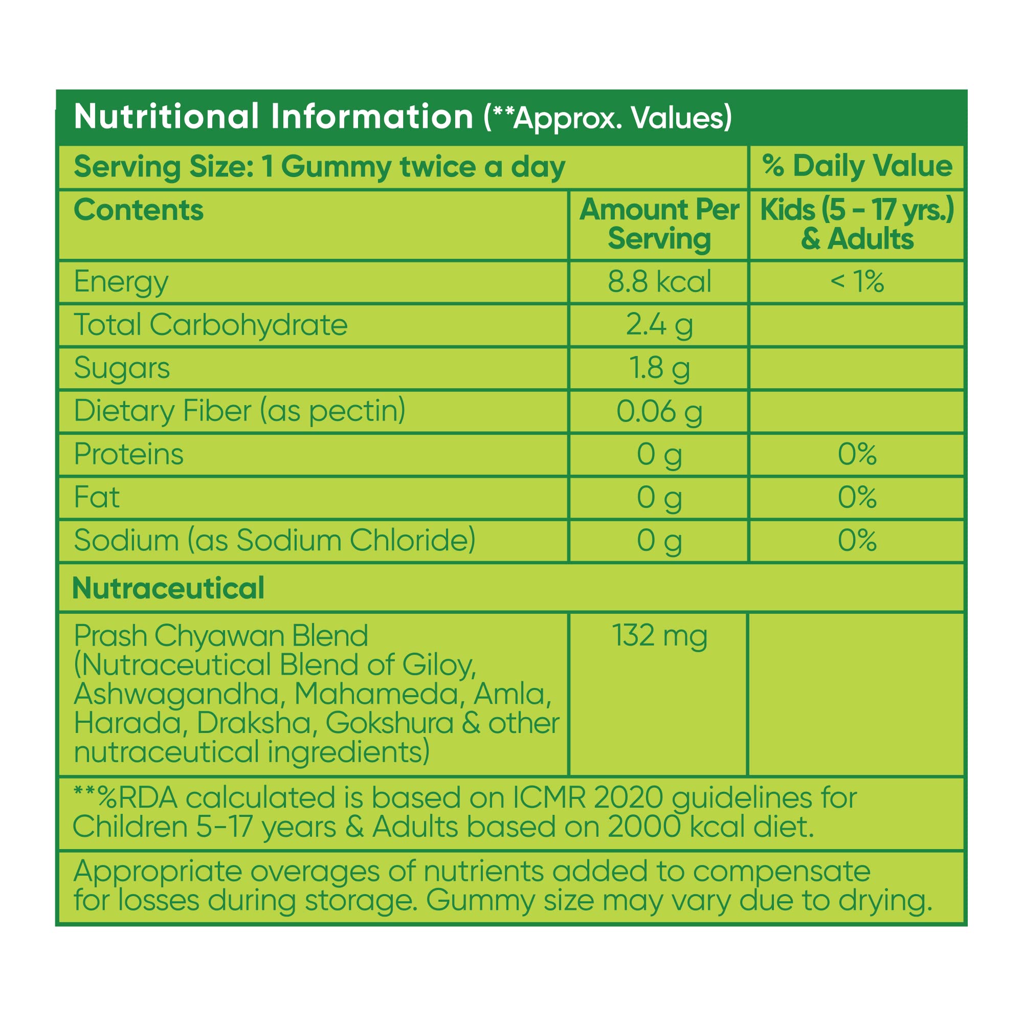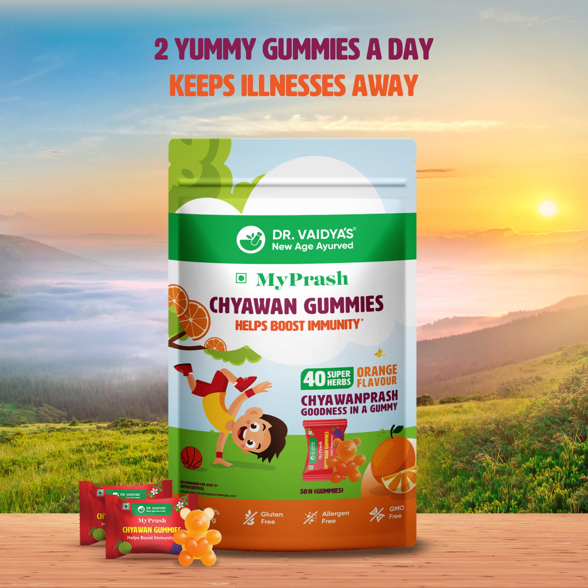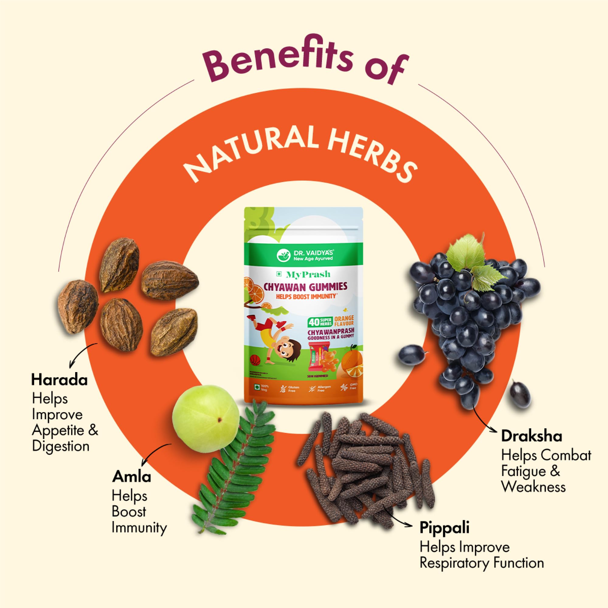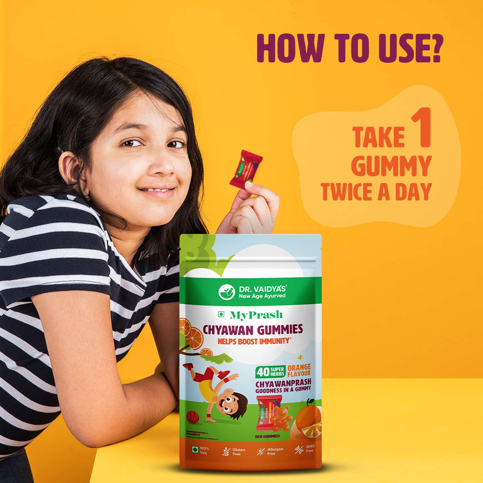 Earlier Chyawanprash was only available in its time-tested paste form. Now the Ayurvedic experts atDR. VAIDYA'S new age ayurveda have made the goodness of Chyawanprash more accessible with the new offering Chyawan Gummies. This yummy gummy is sure to make it easier for you to give your child the benefits of Chyawanprash without any fuss. Chyawan Gummies contains 40 super herbs found in Chyawanprash that are critical for kids' growing minds and bodies. These herbs are known to help boost immunity combat infections improve appetite support digestion and enhance respiratory function. Each gummy is also individually wrapped to make it convenient to add to your child's tiffin. Best of all two Chyawan Gummies provide similar health benefits as one teaspoon of traditional Chyawanprash. And not only kids but adults can also enjoy eating these gummies for the many health benefits of Chyawanprash. While the full list of super herbs in Chyawan Gummies can be found on the packaging there are 4 key ingredients in the gummies: â Amla helps boost long-term immunity â Harada helps support digestion and enhance appetite â Draksha (Grapes) help combat weakness and fatigue â Pippali helps support healthy respiratory function Here's why you should buy Chyawan Gummies: â Formulated by a team of Ayurvedic experts â Made with 100% Ayurvedic actives â Contain clinically researched ingredients â Does not contain metals artificial colours artificial flavours and harmful preservatives â Cause no known side effects â Safe for kids and adults
