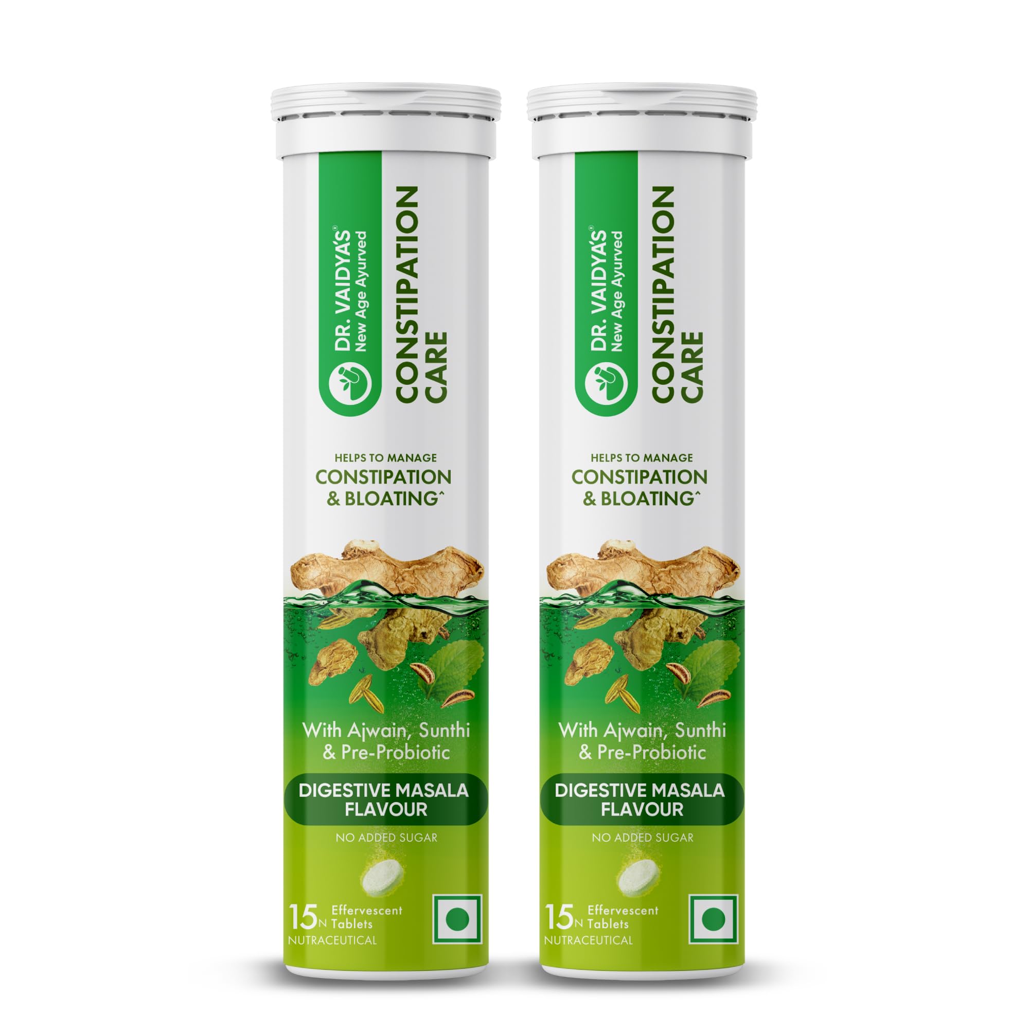 Dr. Vaidya's Constipation Care Effervescent Tablets | Helps Manage Constipation & Bloating | Aragavadh Ajwain Sunthi| Pre & Probiotic Blend| 15 Tablets(Pack of 2) Digestive Masala Flavour