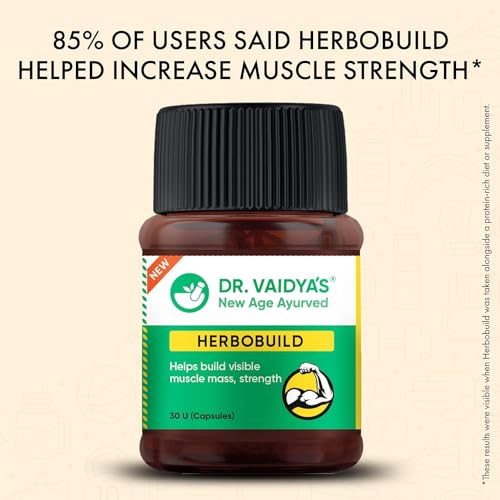 • REDUCES STRESS ANXIETY & FATIGUE: The ayurvedic ingredients present help reduce stress hormone -cortisol and prevent muscle depletion and body fatigue. Dr. Vaidya's Herbobuild capsules also reduce the mental and physical stress of intense workouts fatigue