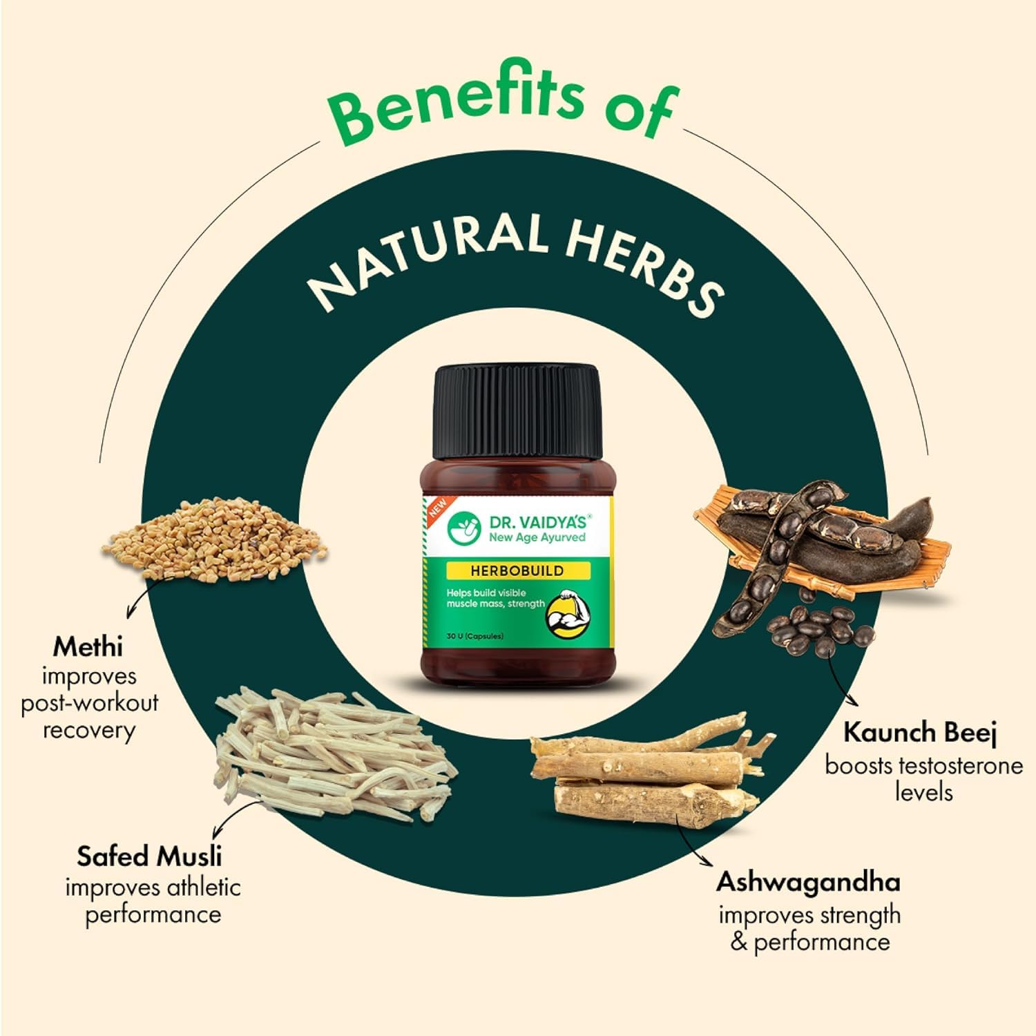Dr. Vaidya's Herbobuild Capsules | Ayurvedic Muscle & Mass Gainer For Enhanced Stamina & Peak Fitness | (30 Capsules Each) Pack of 2