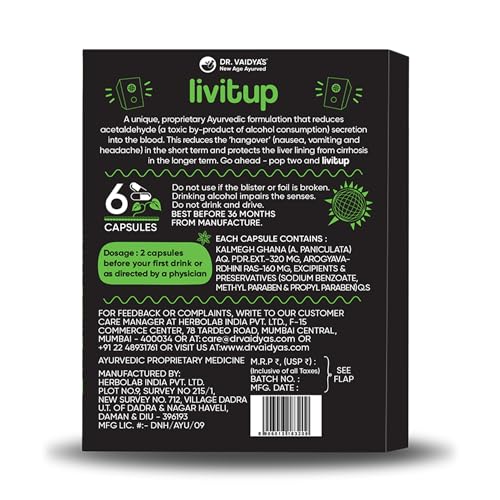 Dr. Vaidya's LIVitup | Hangover Shield & Liver Protector | Helps Prevent Acidity, Nausea & Headache | Kalmegh Ghan & Arogyavardhini Rasa | (6 Capsules) Pack Of 1