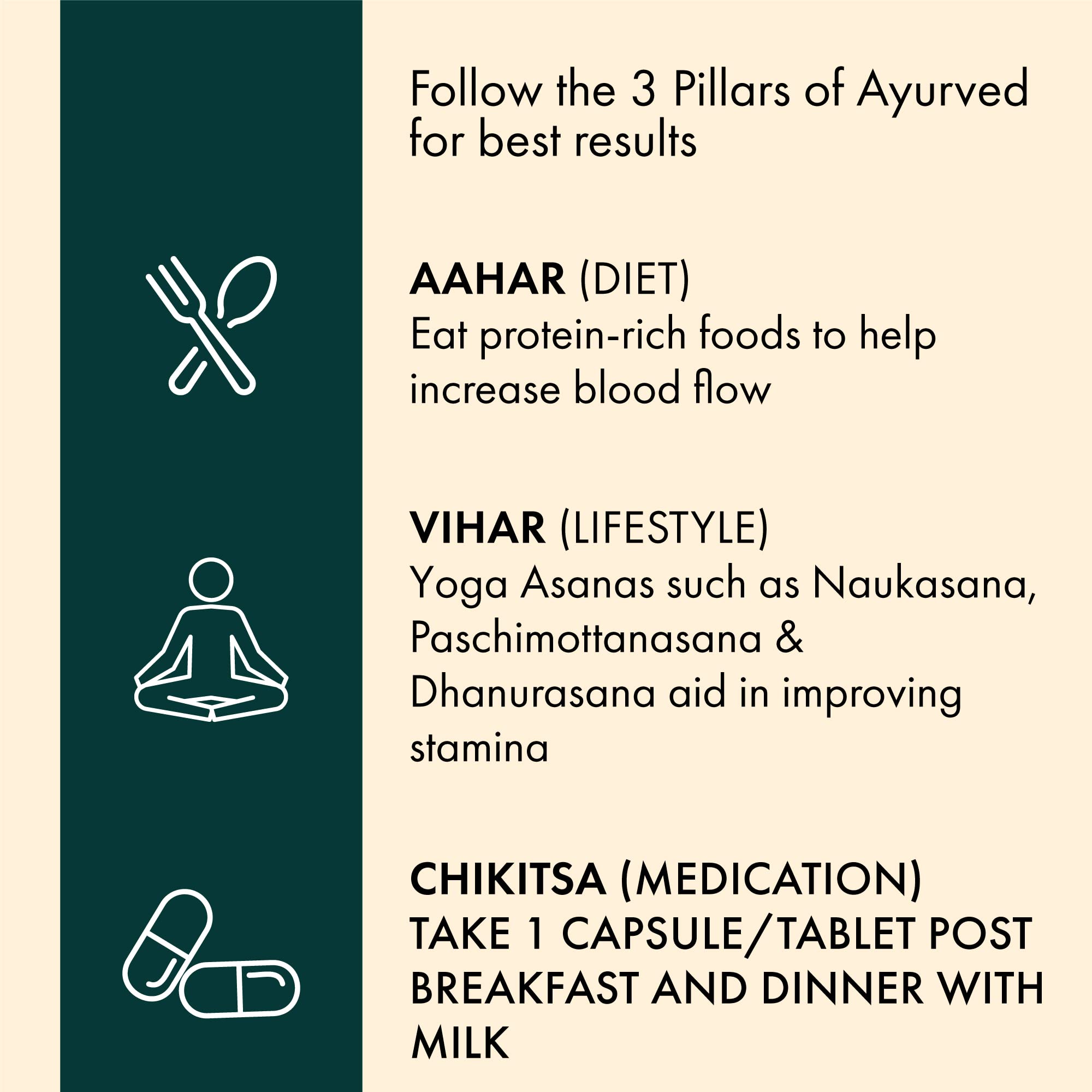 • RECOMMENDED DOSAGE: Take 1 capsule a day after meals or as recommended by physician. Follow a nutritious diet and exercise regularly. Take protein supplements for faster gains. Follow below mentioned tips for better results.