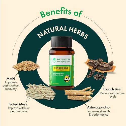 • REDUCES STRESS ANXIETY & FATIGUE: The ayurvedic ingredients present help reduce stress hormone -cortisol and prevent muscle depletion and body fatigue. Dr. Vaidya's Herbobuild capsules also reduce the mental and physical stress of intense workouts fatigue