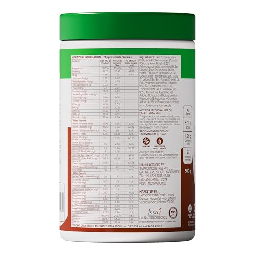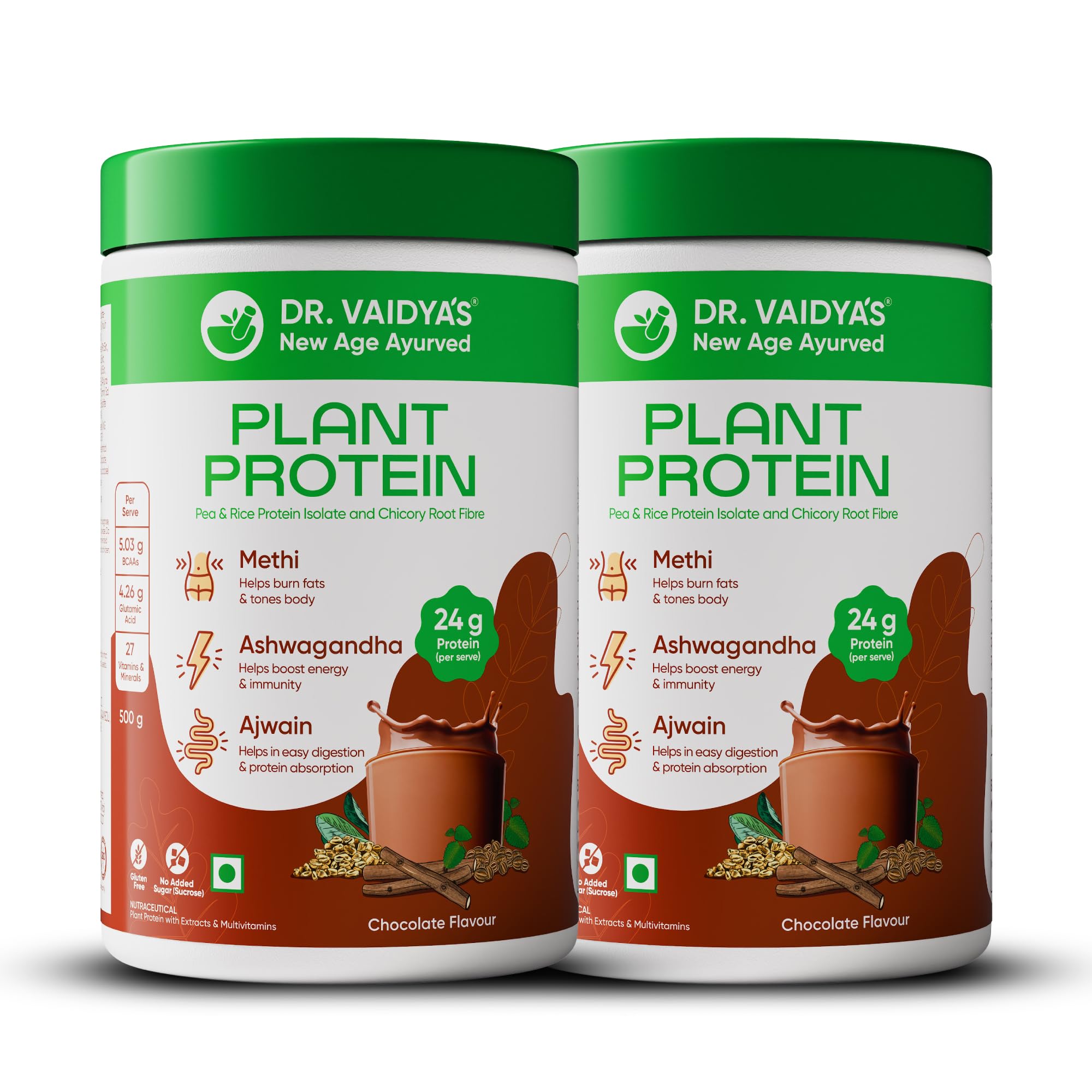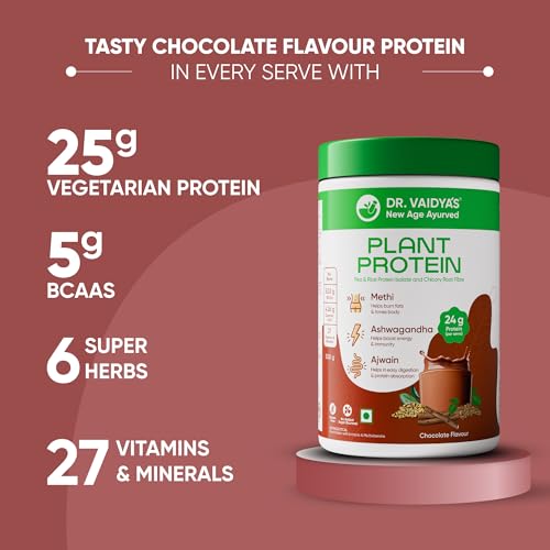 Dr Vaidya’s Plant Protein Powder | Gut Health | 80% Pea Protein | Methi, Ashwagandha, Ajwain | Gluten Free | No Added Sugar | Chocolate Flavour (500g)
