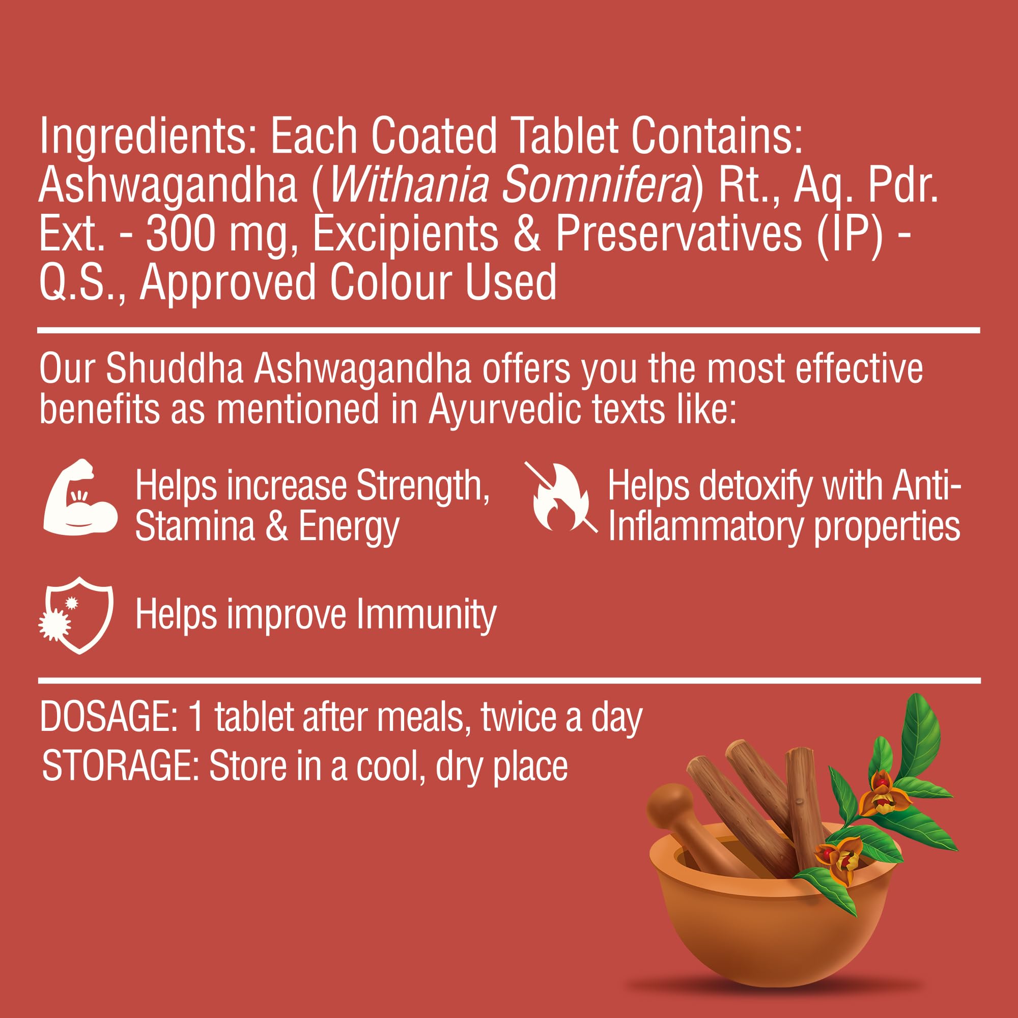 Experience the power of Shuddha Ashwagandha the most effective stress reliever and immunity booster that can unlock your inner well-being. Made with utmost care and precision our Shuddha Ashwagandha tablets are prepared through a unique 3-step Sanskara process ensuring maximum purity and potency. Discover the remarkable benefits of this time-tested herb and enhance your overall health and well-being.
