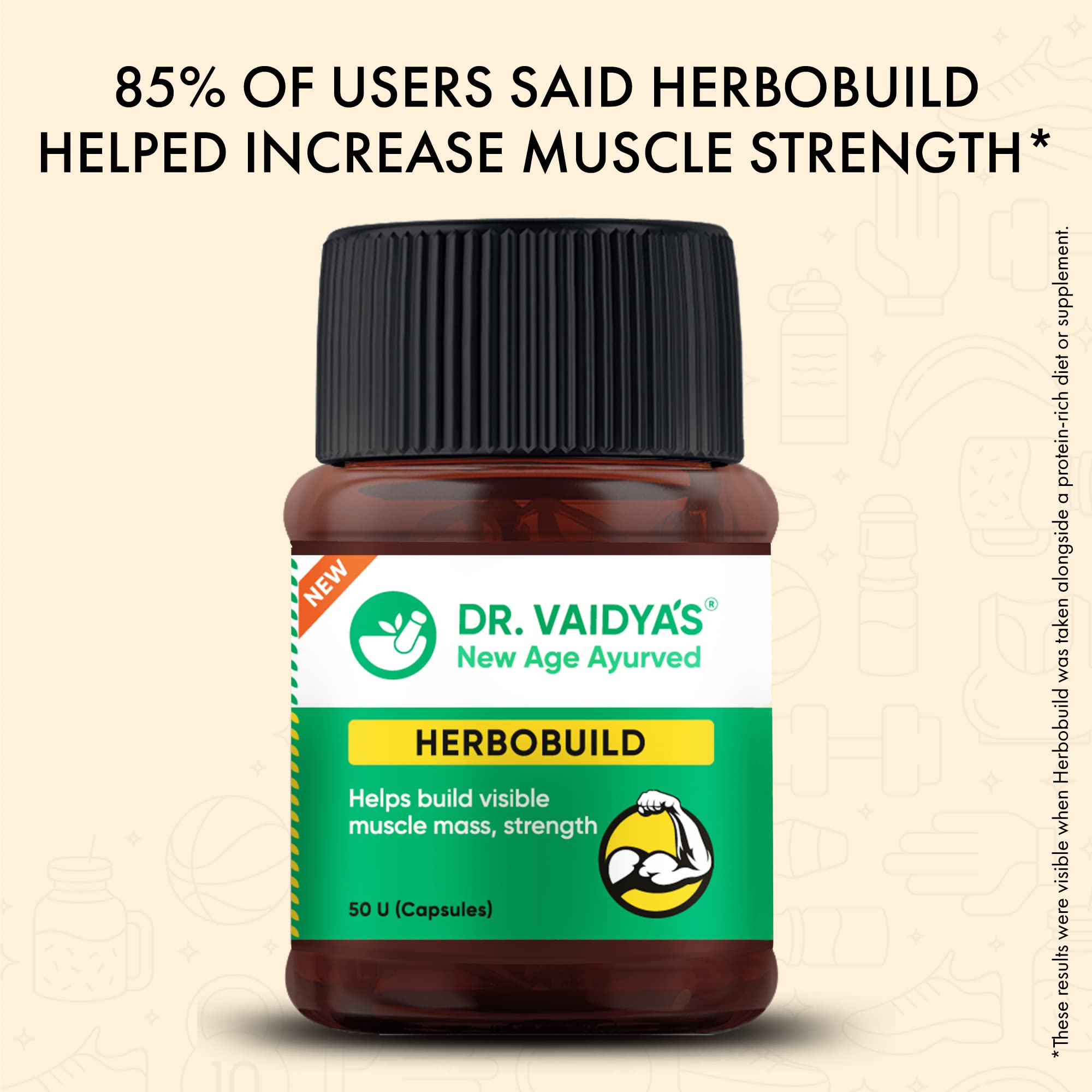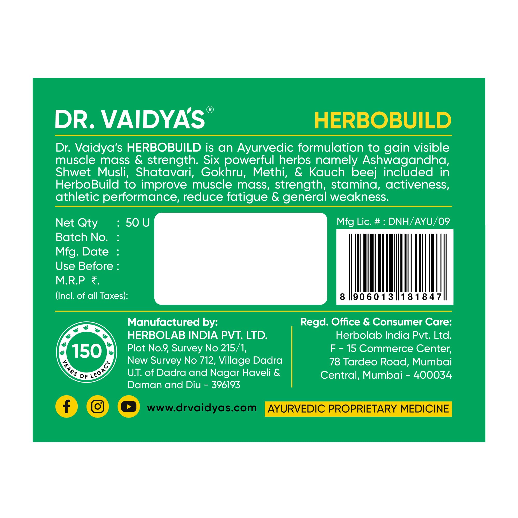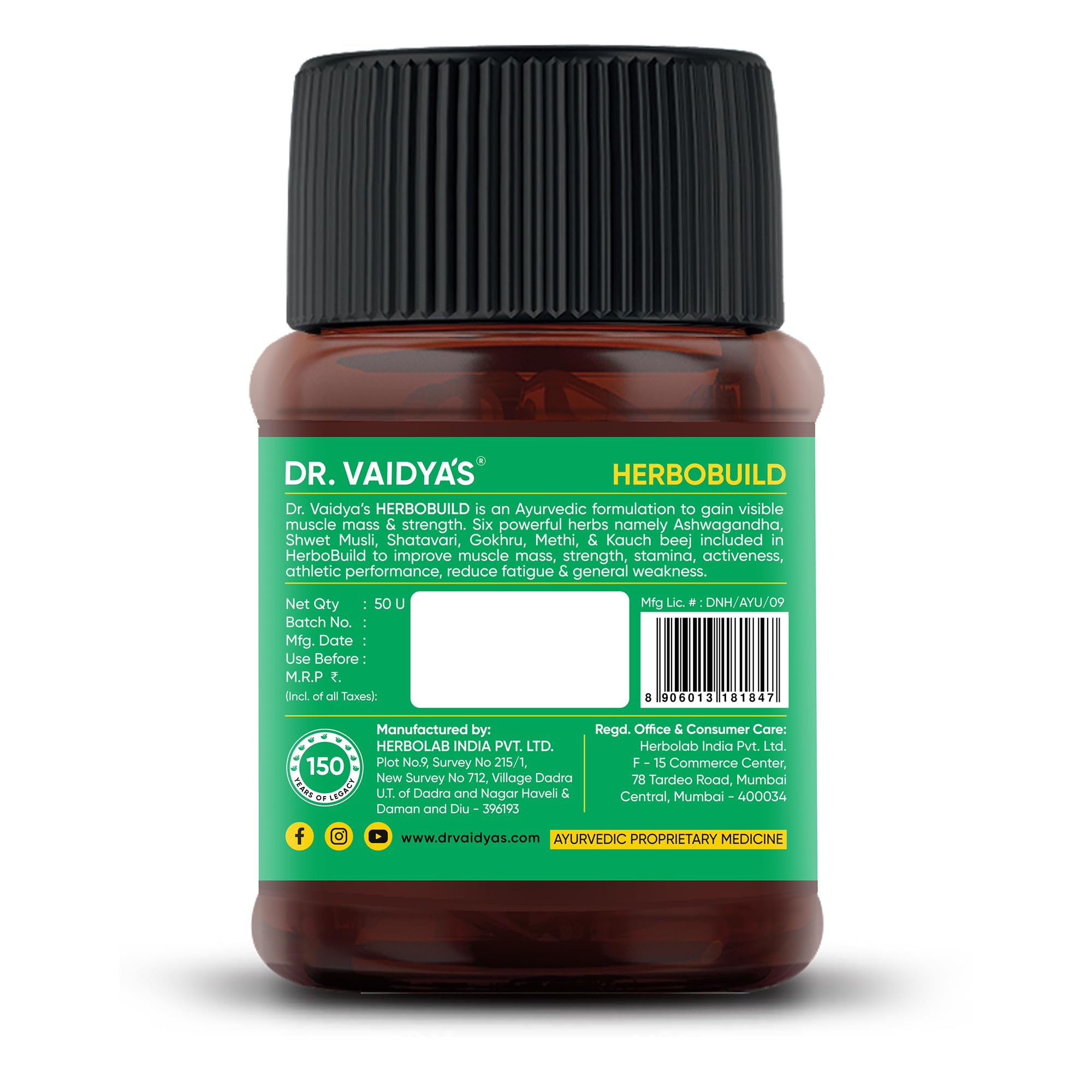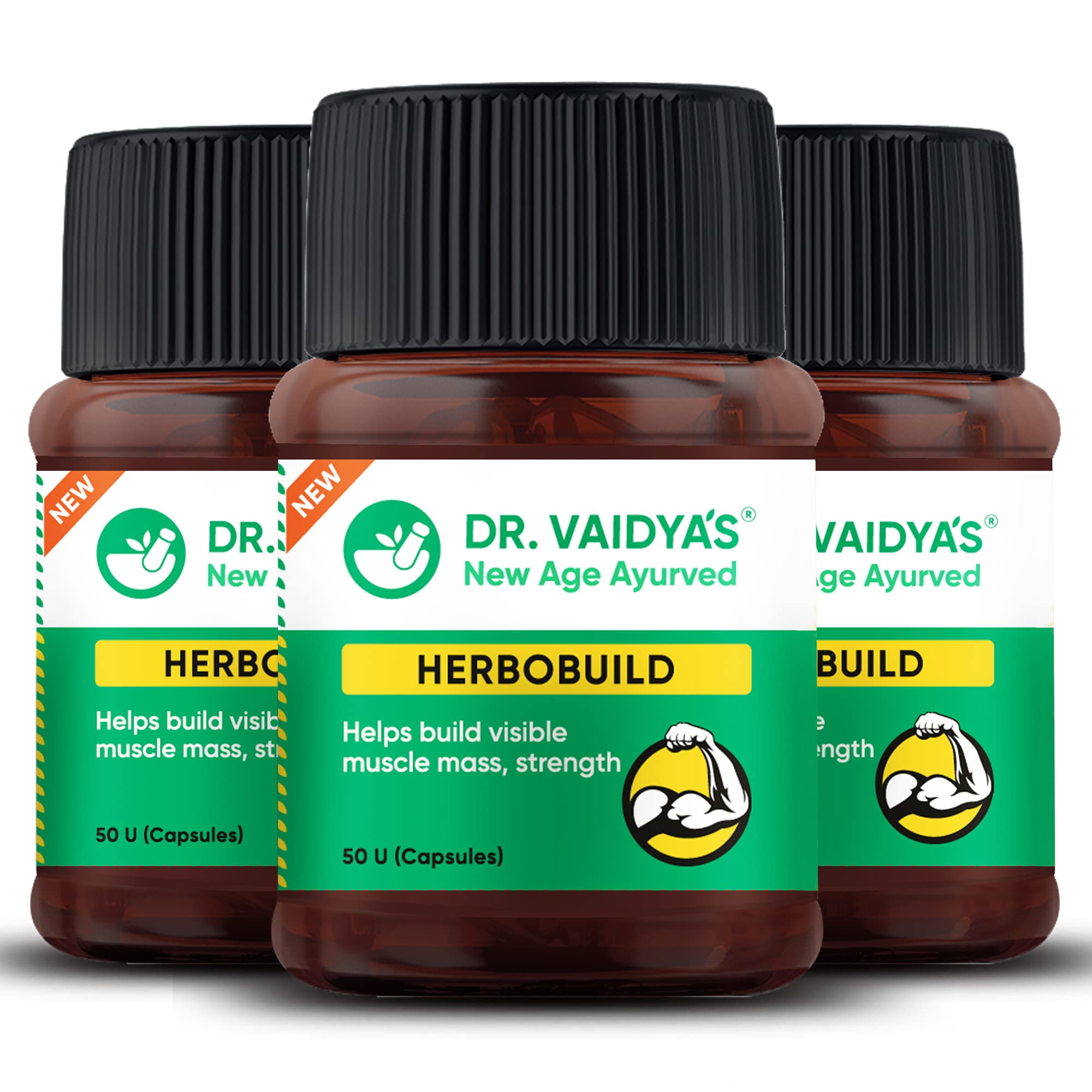 Dr.Vaidya's Herbobuild | Ayurvedic Muscle & Mass Gainer Capsules | Muscle Protein Synthesis | Lean Mass Gainer | Improved Stamina & Strength (Pack of 3 (50 Capsules))