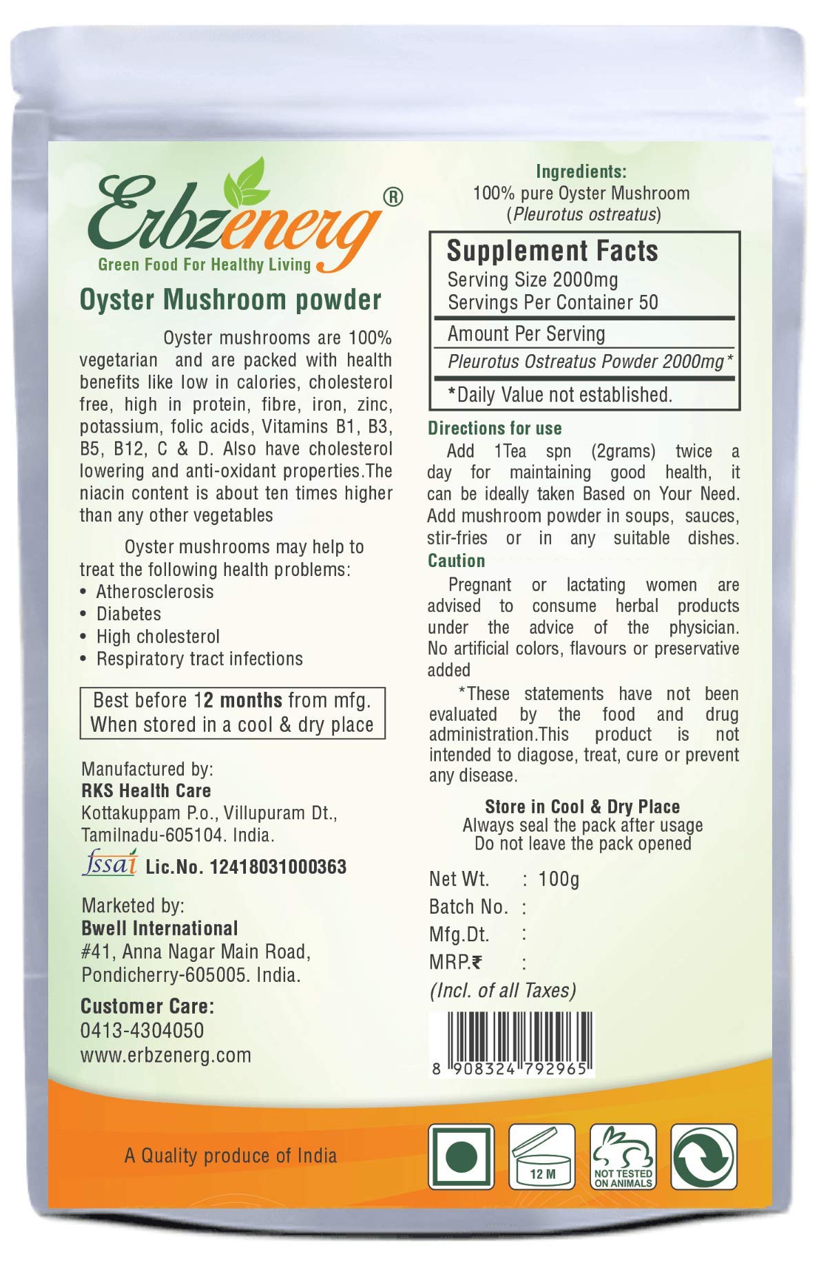 ERBZENERG Organic OYSTER MUSHROOM 100G | PACK OF 3