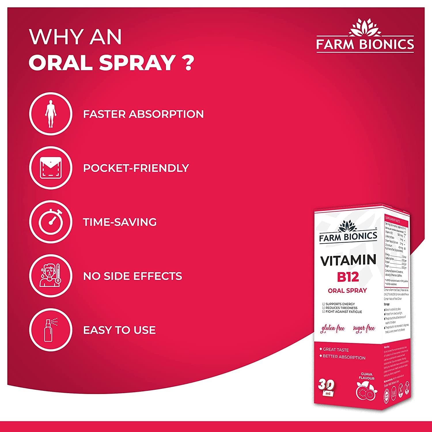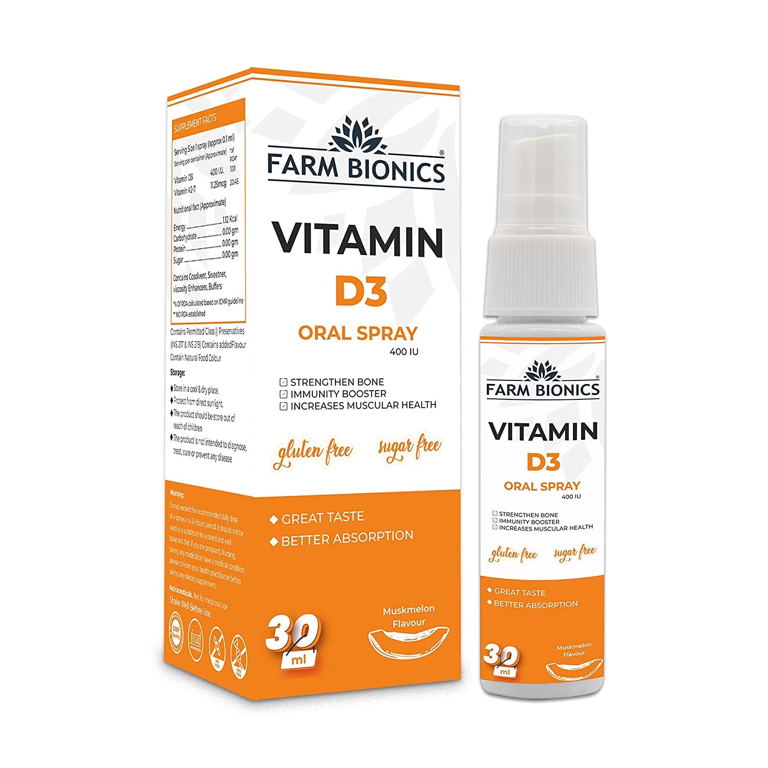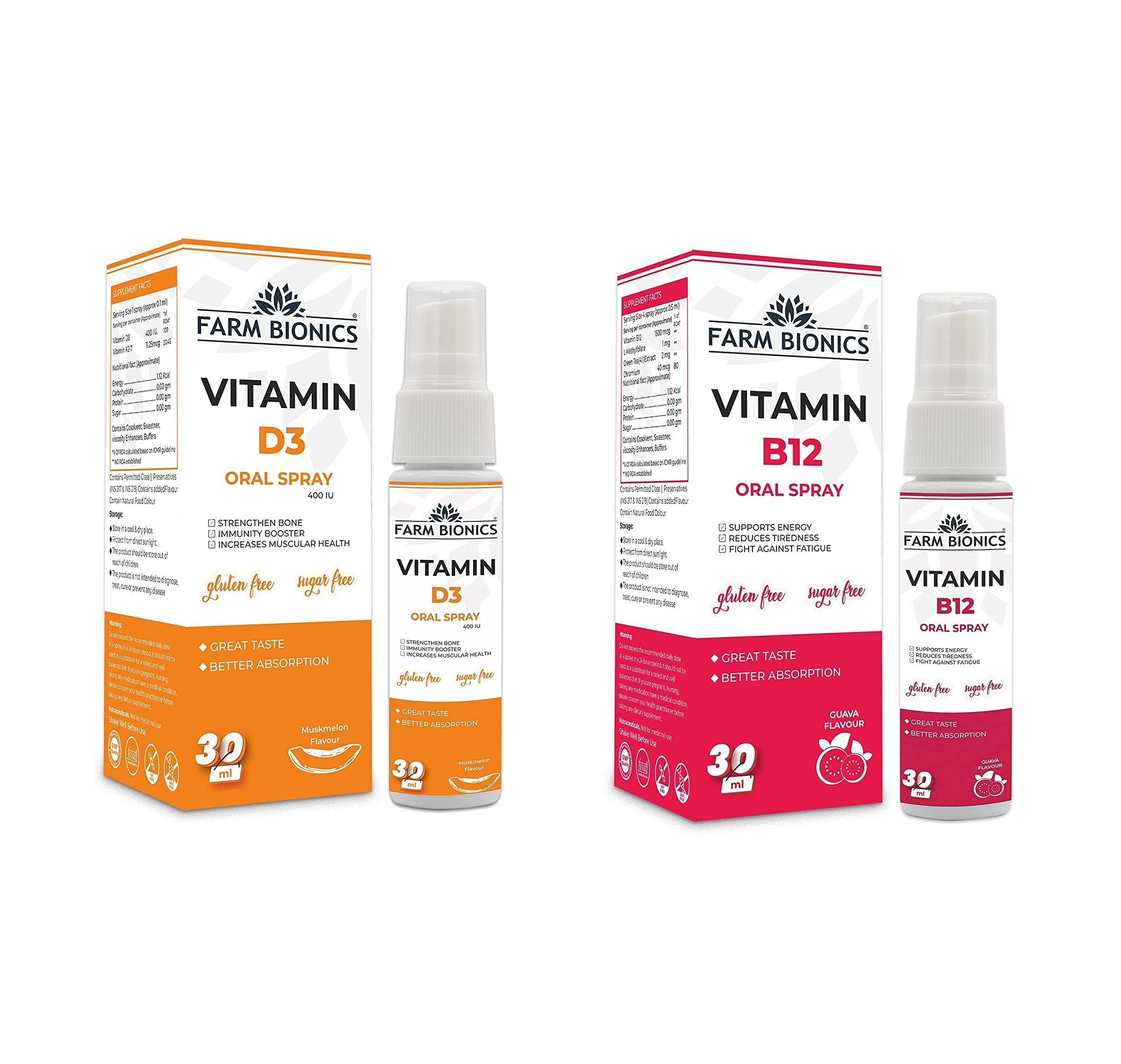 FARM BIONICS Vitamin B12 Booster Guava Flavour Oral SprayB12 Oral Spray : Vitamin B12 is a key vitamin that is usually found in meat fish and dairy. It has also been shown to help with Daily Body WorksB12 Oral Spray : No more hard-to-swallow tablets Drinks and Powder. An easy-to-use oral spray B12 Booster is fast effective and great tasting. Studies show that our vitamin oral spray technology is a more effective delivery method than traditional Spray or tablets.B12 Oral Spray : It is beneficial in keeping the cholesterol level in the body right giving energy to the body and Very beneficial for all types of Skin Hair and Nails.B12 Oral Spray : This B12 vitamin comes in great tasting Guava flavor and other natural flavors with zero calories. This supplement is loaded with key ingredients like Green tea Extract and Chromium in a convenient advanced oral spray.FARM BIONICS Vitamin D3 Booster Musk melon Flavour Oral SprayD3 Oral Spray: Vitamin D3 is a key vitamin that is usually found in meat fish and dairy. It has also been shown to help with Daily Body WorksD3 Oral Spray: No more hard-to-swallow tablets Drinks and Powder. An easy-to-use oral spray D3 Booster is fast effective and great tasting. Studies show that our vitamin oral spray technology is a more effective delivery method than traditional Spray or tablets.D3 Oral Spray: It is beneficial in keeping the cholesterol level in the body right giving energy to the body and Very beneficial for all types of Skin Hair and Nails.D3 Oral Spray: This D3 vitamin comes in great tasting Guava flavor and other natural flavors with zero calories. This supplement is loaded with key ingredients like Green tea Extract and Chromium