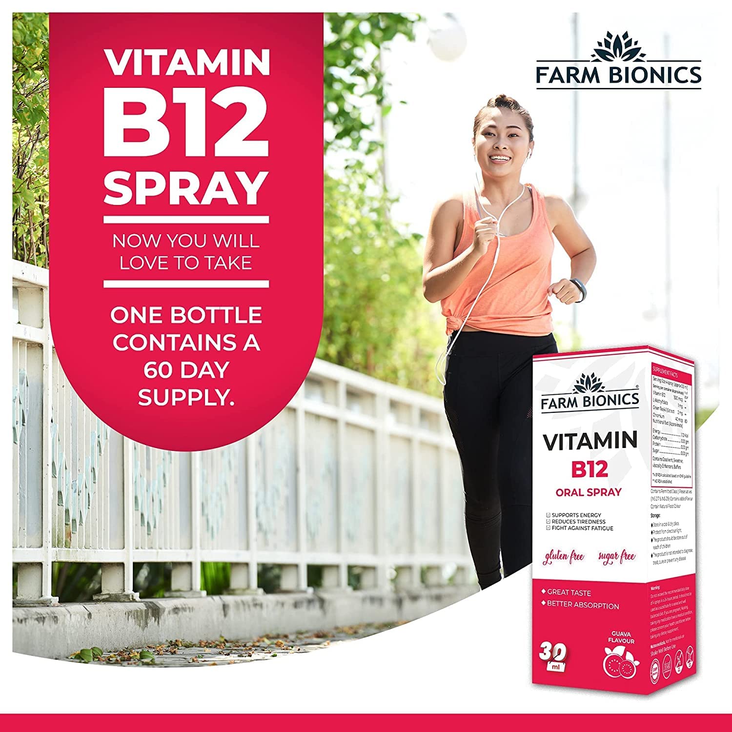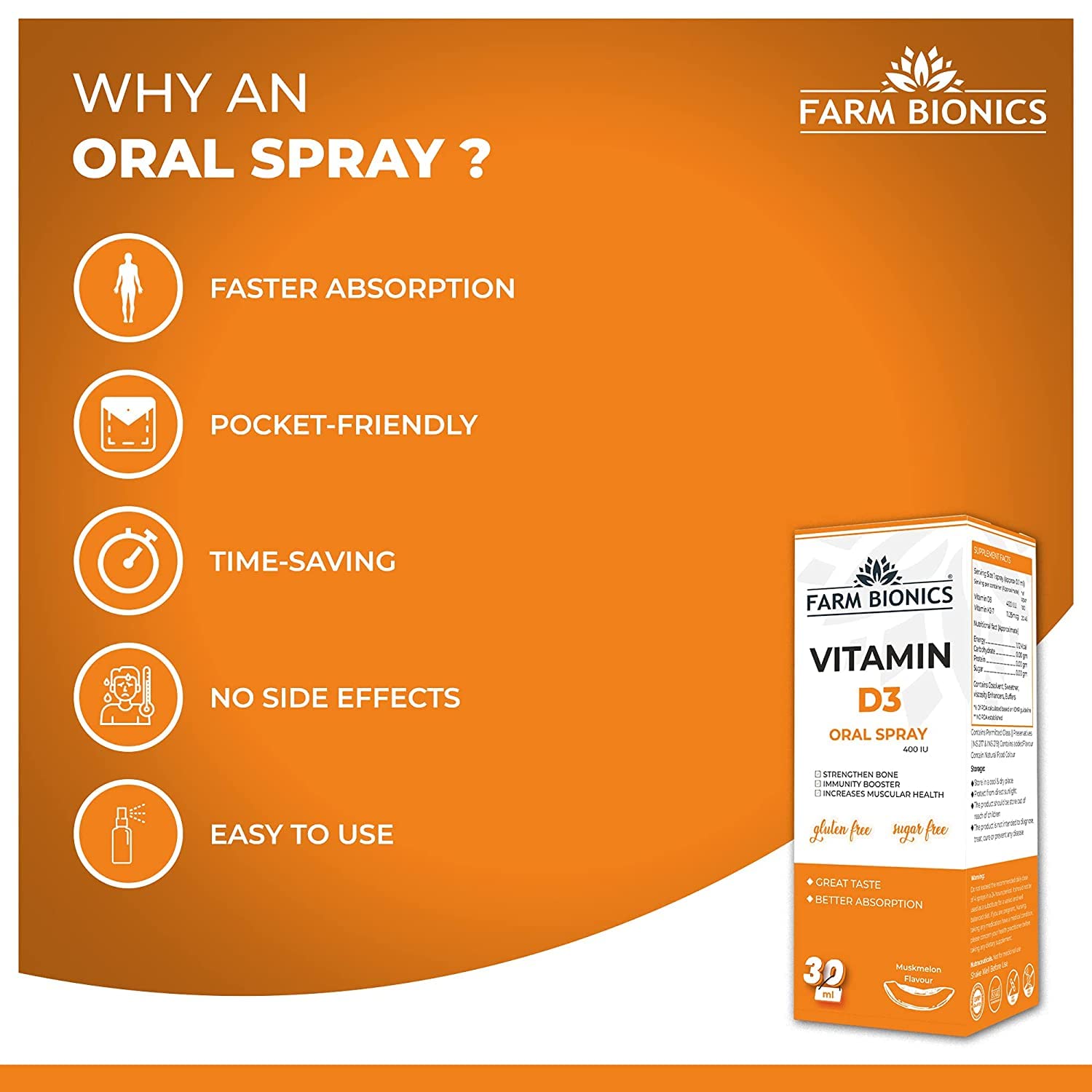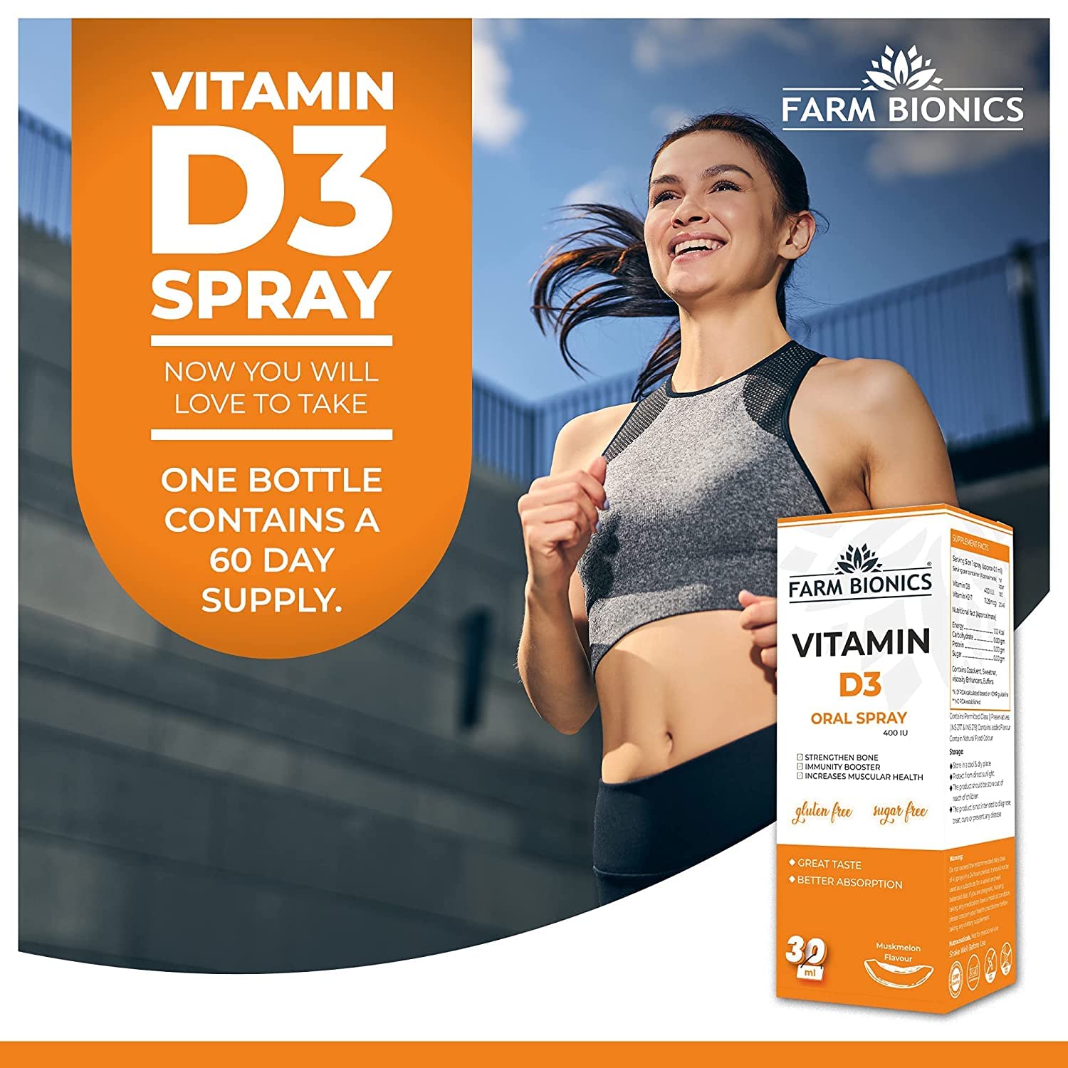 FARM BIONICS Vitamin B12 Booster Guava Flavour Oral SprayB12 Oral Spray : Vitamin B12 is a key vitamin that is usually found in meat fish and dairy. It has also been shown to help with Daily Body WorksB12 Oral Spray : No more hard-to-swallow tablets Drinks and Powder. An easy-to-use oral spray B12 Booster is fast effective and great tasting. Studies show that our vitamin oral spray technology is a more effective delivery method than traditional Spray or tablets.B12 Oral Spray : It is beneficial in keeping the cholesterol level in the body right giving energy to the body and Very beneficial for all types of Skin Hair and Nails.B12 Oral Spray : This B12 vitamin comes in great tasting Guava flavor and other natural flavors with zero calories. This supplement is loaded with key ingredients like Green tea Extract and Chromium in a convenient advanced oral spray.FARM BIONICS Vitamin D3 Booster Musk melon Flavour Oral SprayD3 Oral Spray: Vitamin D3 is a key vitamin that is usually found in meat fish and dairy. It has also been shown to help with Daily Body WorksD3 Oral Spray: No more hard-to-swallow tablets Drinks and Powder. An easy-to-use oral spray D3 Booster is fast effective and great tasting. Studies show that our vitamin oral spray technology is a more effective delivery method than traditional Spray or tablets.D3 Oral Spray: It is beneficial in keeping the cholesterol level in the body right giving energy to the body and Very beneficial for all types of Skin Hair and Nails.D3 Oral Spray: This D3 vitamin comes in great tasting Guava flavor and other natural flavors with zero calories. This supplement is loaded with key ingredients like Green tea Extract and Chromium