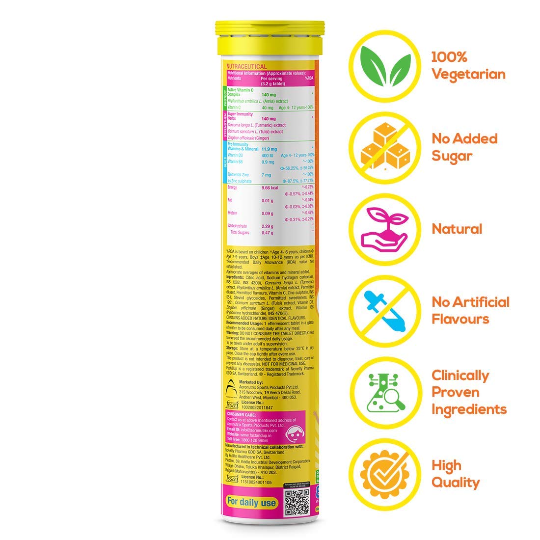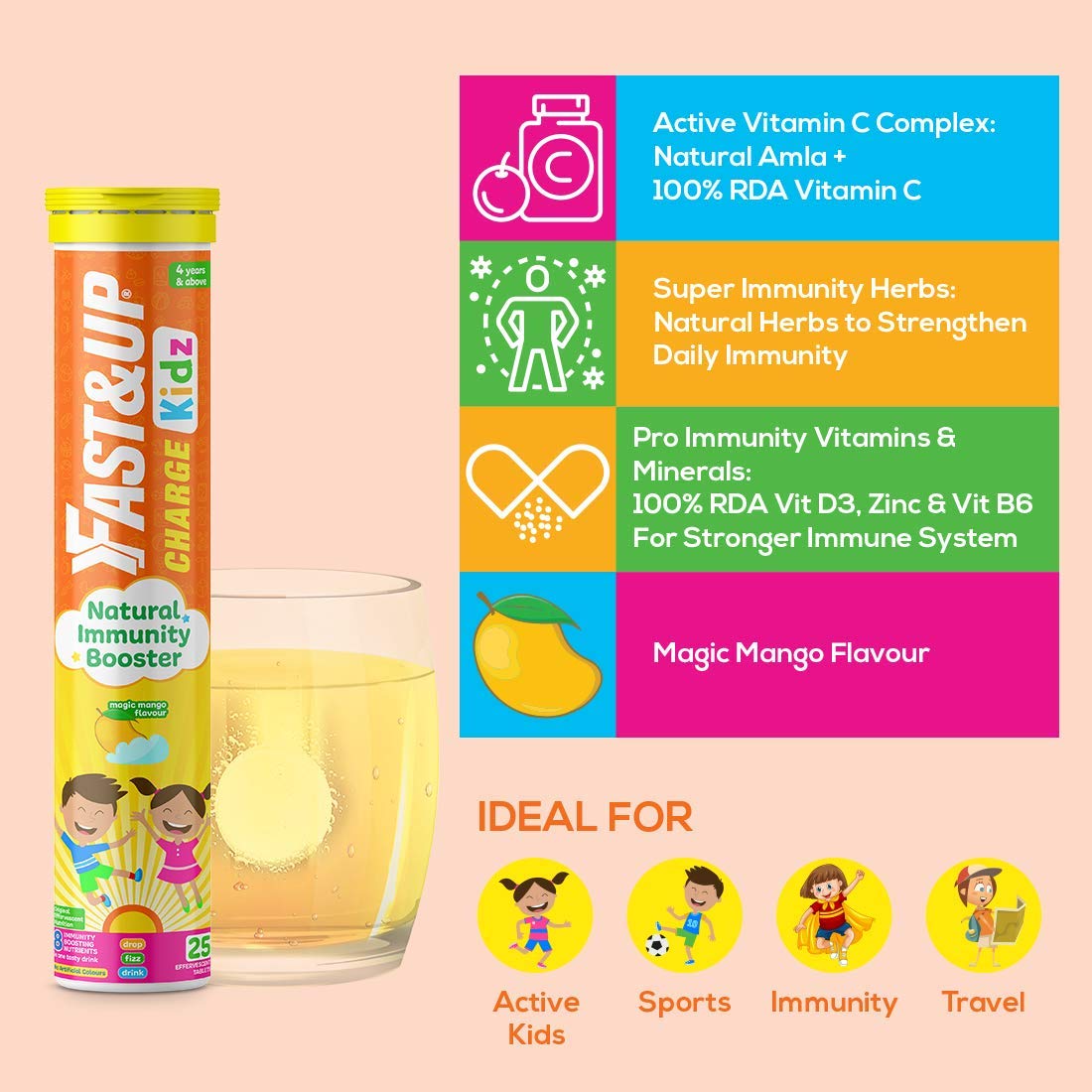 Fast&Up Charge Kids - Daily Immunity Essential Multivitamin for Kids - Zinc Vitamin C D3 & B6 with Turmeric Ginger & Tulsi Extracts (25 Effervescent Tablets Mango Flavor)Fast&Up Charge Kids designed with 8 Natural Immunity Boosting Nutrients in one tasty drink helps to protect strengthen and build daily immunity. Formulated with three intelligent well - researched and scientifically backed complexes like Active Vitamin C Complex Super Immunity Herbs and Pro Immunity Vitamins & Minerals helps to provide daily natural immunity and promote general well - being. Active Vitamin C Complex comprises 140mg Natural Amla Extract and 40mg Vitamin C. Amla Extract is a well-known and rich source of Vitamin C along with natural bioflavonoids and antioxidants. Vitamin C helps to protect against harmful pathogens bioflavonoids present in Natural Amla extract helps to enhance antioxidant properties of Vitamin C. Super Immunity Herb with Turmeric Extract Tulsi Extract and Ginger helps to strengthen the body's defense system to fight germs. Formulated with all-natural high-quality and scientifically-backed herbs it helps to strengthen and maintain the immune system and helps to enhance immune response to harmful pathogens. Alongside Active Vitamin C Complex and Super Immunity Herbs Fast&Up Charge Kids also provides 100% RDA of Vitamin D3 Zinc & Vitamin B6 with Pro Immunity Vitamins & Minerals to build a stronger immune system. Each Charge Kids tablet formulated with premium Swiss effervescent technology and recommended by experts helps to provide faster nutrient absorption with higher bioavailability as compared to normal supplements in Magic Mango flavour with no added sugar. With Original Effervescent Nutrition Fast&Up Charge Kids it is easy to consume just drop 1 tablet in 250ml water wait till it dissolves completely and have it after a meal & charge your immunity.Fast&Up Reload electrolyte energy and hydration drink - 20 effervescent tablets - Berry flavourFast&Up is India's first effervescent nutrition brand to keep you active. Fast&Up Reload is a hypotonic hydration drink with the ideal combination of Electrolytes Vitamins Minerals and Antioxidants to rehydrate and maintain electrolyte balance during the workout and your everyday active lifestyle. It is India's first Informed choice electrolyte drink. Fast&Up Reload supplement is available in effervescent tablet form which helps you to replenish electrolytes without any digestive issues. With its unique formulation this electrolyte sports drink ensures instant hydration. Because of its hypotonic nature Reload increases the rate at which water is absorbed by the body and speeds up the rehydration process. Evidence suggests that a hypotonic sports drink provides minimally to moderately faster fluid absorption than more concentrated isotonic-hypertonic sports drinks. Fast&Up Reload contains Calcium and Magnesium along with electrolytes to help prevent cramps. Vitamin C in this sports electrolyte drink helps reduce muscle soreness and fatigue. This easy to carry electrolyte drink understands the serious needs of hydration and is uniquely formulated without any overloading of sugar. Fast&Up Reload can be consumed by anyone during workout or anytime during the day by someone who leads an active life to help fight exhaustion. Maximum Shelf Life : 18 Months