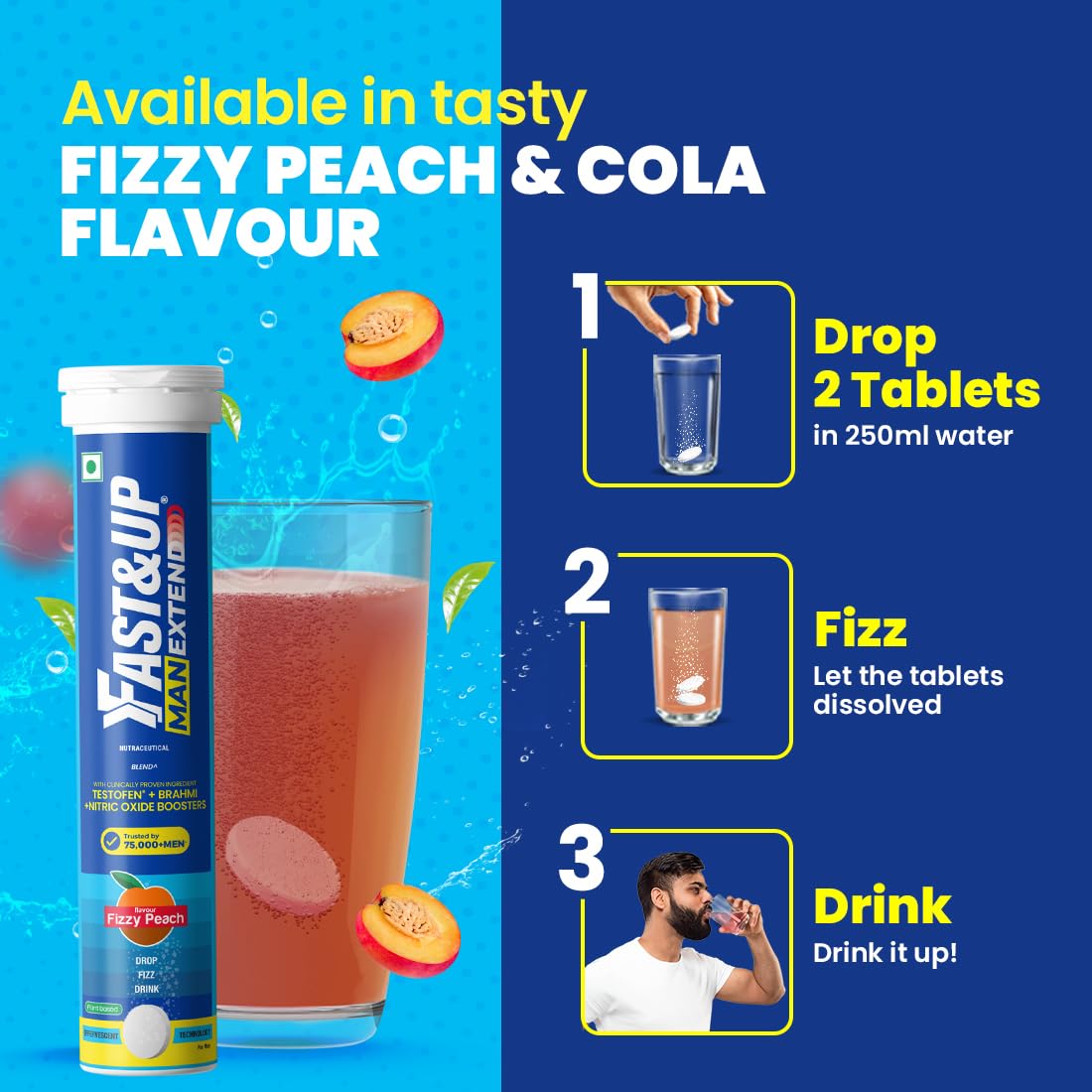 Fast&Up Man Extend | Testofen Fenugreek Extract |Nitric Oxide Booster + Energizing Blend | Shatavari | Brahmi| Helps Improves Vitality & Stamina | Pack of 20 Effervescent (Peach Flavour)