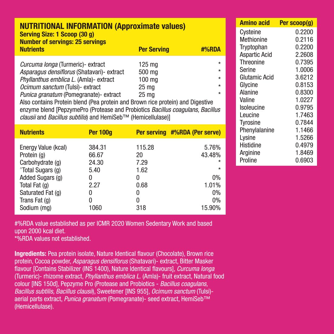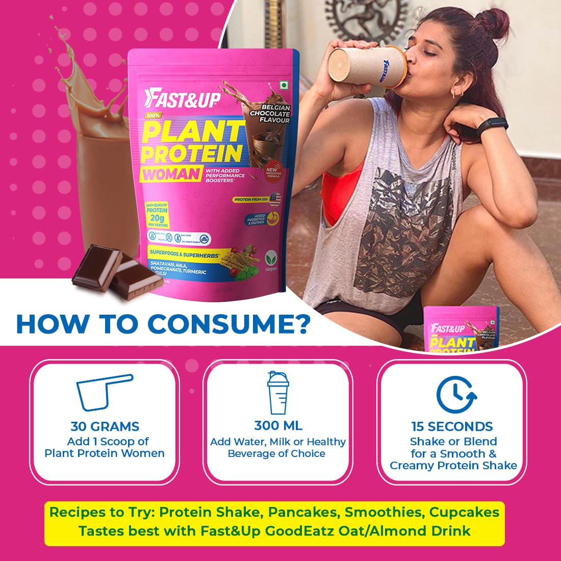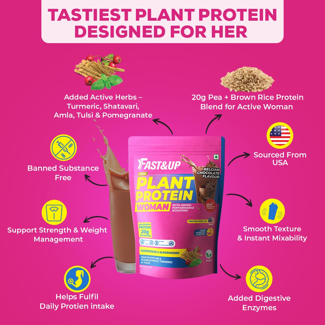 Packed with Natural Ingredients Fast&Up Plant Protein for Women is well researched and formulated with clinically proven 100% vegan ingredients such as Protein Blend Super Skin Blend Stress Management Blend and Digestive Enzyme Blend that helps fulfil daily protein requirements promotes toned body and fitness and supports weight management. Protein is an important macronutrient that plays a vital role in connective tissue bones hair and nails. As women age bone health and density is important Protein helps to maintain strong bone and helps to minimize bone density loss that is associated with ageing Fast&Up Plant Protein for Women provides a complete amino acid profile which is sourced from Pea and Brown Rice Protein. Factors such as air pollution eating habits and lifestyle have a direct negative impact on skin health Super Skin Blend which consists of Pomegranate extract Amla extract and Turmeric extract help to protect skin health provide elasticity and firmness. They are a rich s