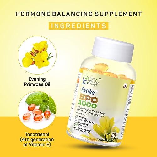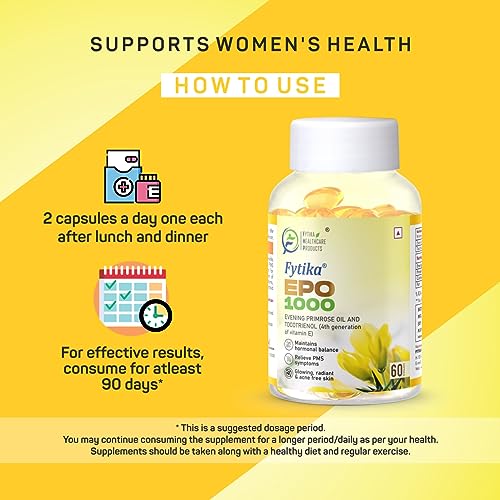 Fytika Epo 1000 Evening Primrose Oil and Tocotrienol Caps. | For Healthy and Acne free Skin | Supports Hormonal Balance in Women | Helpful in PMS & Menopause | Natural Oil Extract 60 Softgels Caps.