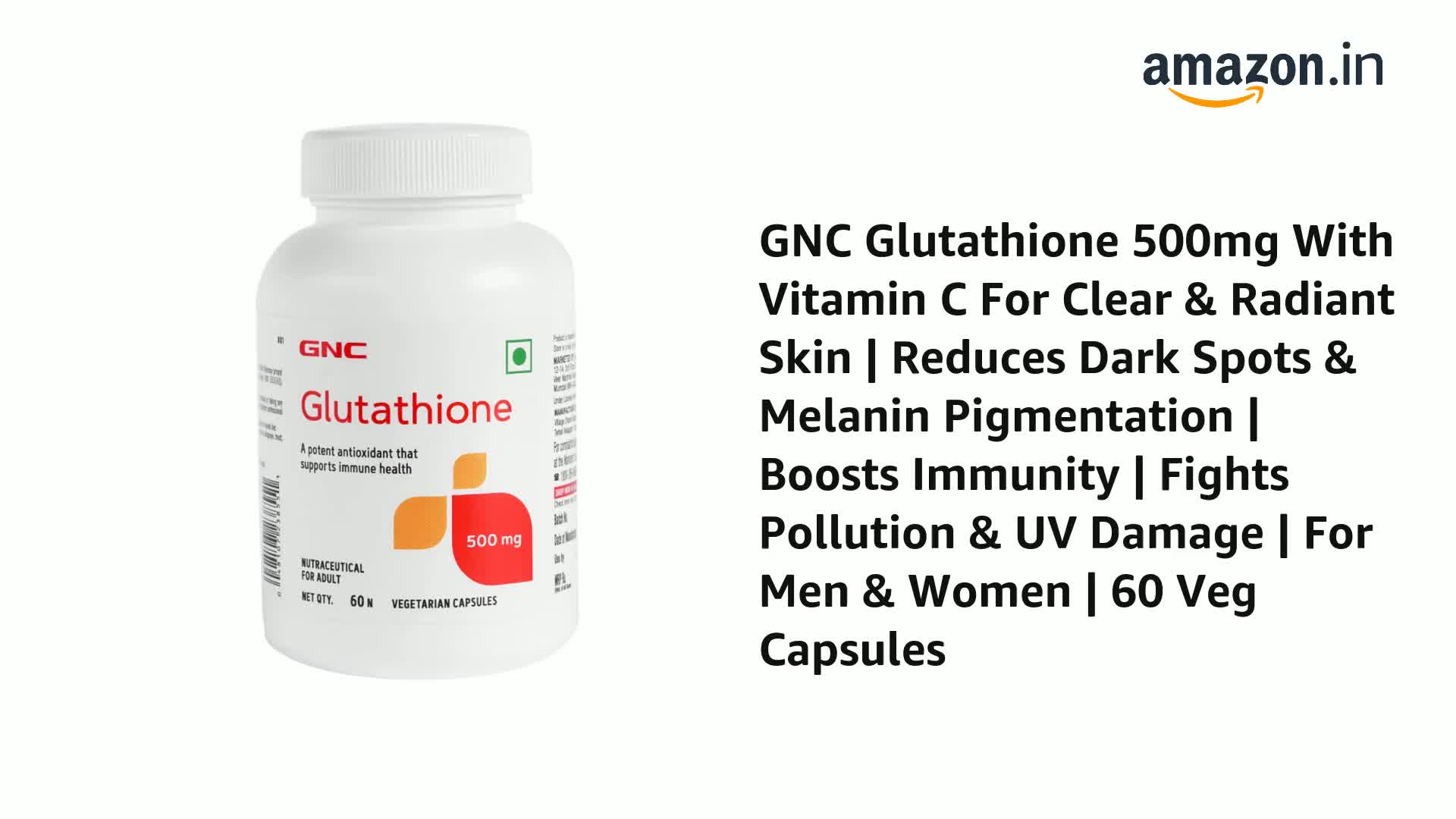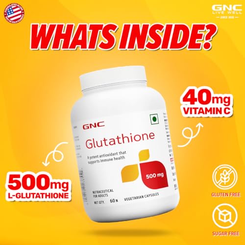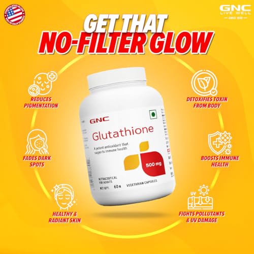 Experience beautiful skin and better immunity everyday with the GNC Glutathione 500mg capsules. Formulated with knowledge and care this supplement contains Glutathione in its reduced & active form L-Glutathione to deliver the intended results with amazing efficiency. It also includes a crucial supporting ingredient Vitamin C that intensifies the benefits. Vitamin C not only improves the Glutathione absorption but also further augments Glutathioneâs advantages in providing antioxidant protection skin brightening and other advantages. One of the major shifts youâll experience with the GNC Glutathione is significant reduction in dark spots and visible brightening of your skin. This Glutathione helps minimise melanin production and fades out pigmentation marks to give you a luminescent & even-toned skin. Vitamin C in the formula helps reduce sun-induced skin patches and boost collagen levels for a smoother and radiant appearance. Glutathione and Vitamin C in the formula form a powerful antioxidant pair to eliminate free radicals generated as a detrimental effect of UV rays pollution and other daily stressors. They prevent oxidative harm to ensure better immunity and skin health. GNC Glutathione gives your body a thorough detox by completely removing all of the toxins. This detoxification restores the natural balance of all the inner workings of your body. Glutathione and Vitamin C boost your immunity by stimulating healthy production of infection-fighting cells. These cells improve your bodyâs immune defences to prevent all kinds of bacterial viral and other infections.