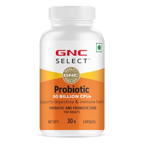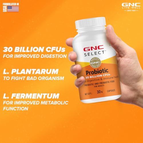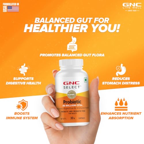 Your journey to holistic wellness with GNC Select Probiotics will always be the best. Our carefully crafted formula delivers 30 billion CFUs of beneficial bacteria per serving fortified with prebiotic fiber inulin to nourish your gut microbiome. Designed specifically for adults these probiotics support digestive health enhance immune function and optimize nutrient absorption empowering you to thrive from the inside out. Each capsule contains a potent blend of probiotic strains including Lactobacillus and Bifidobacterium to foster a healthy gut environment and promote optimal digestion. By fortifying the gut barrier and modulating immune responses GNC Select Probiotics help bolster your body's natural defenses enhancing resilience against harmful pathogens and promoting overall immune health. Focusing on nurturing a balanced microbiome our probiotics support digestive comfort and contribute to overall well-being by optimizing nutrient absorption and promoting gut health.