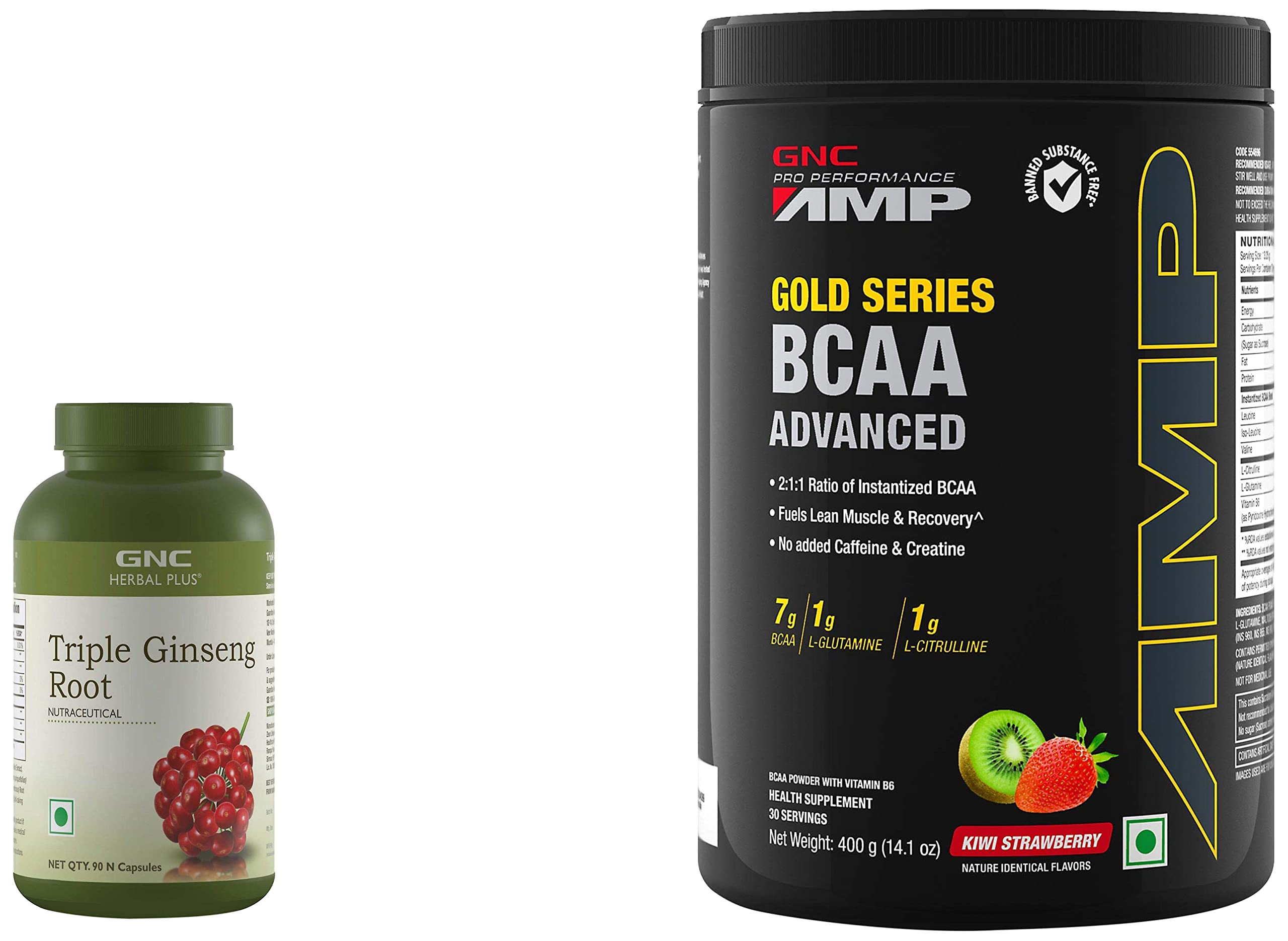 GNC Triple Ginseng Root - 90 CapsulesGNC Mega Men 50 plus One Daily is an ultra-concentrated with 39 important nutrients which include 18 vitamins & minerals. GNC Mega Men 50 plus One Daily contains a clinically studied men's multivitamin shown to work better than a basic multivitamin. GNC Mega Men 50 plus One Daily contains a clinically studied men's multivitamin shown to work better than a basic multivitamin.Packed with antioxidants to help protect against harmful free radicals that can destroy healthy cells and promote cell aging. Features B-vitamins like Folic Acid Vitamin B-1 to support energy production & metabolism and can also protect your heart. Features lycopene and saw palmetto to support optimal prostate function & normal urinary flow. Contains L-arginine which helps to maintain blood vessel tone and thus plays a key role in sexual health.GNC L-Citrulline Glutamine Amp Gold Series BCAA Advanced Powder for Adults- 400 gm (Kiwi Strawberry)GNC Amp Gold Series BCAA Advanced - 400 gm (Kiwi Strawberry) contains 7g of Instantized BCAA in optimal 2:1:1 ratio- 3.5g Leucine 1.75g Iso-Leucine & 1.75g Valine. It also contains 1g of L-citrulline (precursor of arginine) for better muscle strength & 1g of L-glutamine to improve recovery and immunity. Its a versatile sports drink for both pre- and post-workout.