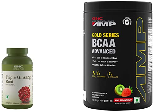GNC Triple Ginseng Root - 90 Capsules & L-Citrulline, Glutamine Amp Gold Series BCAA Advanced Powder for Adults- 400 gm (Kiwi Strawberry)