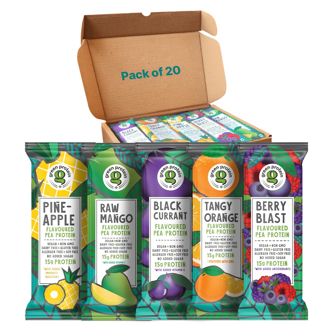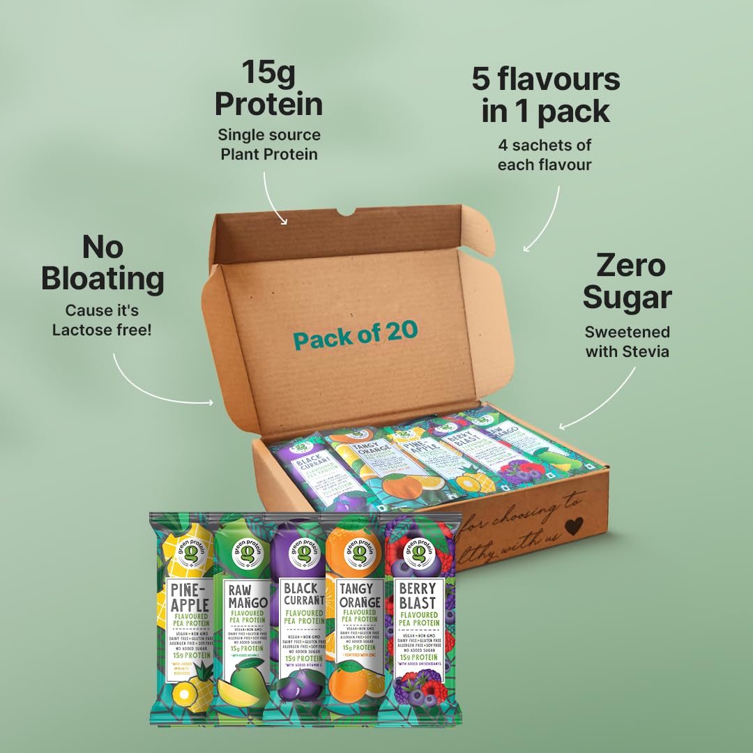 GREEN PROTEIN Pea Protein Isolate Powder Vegan Plant Protein Dairy Free With No Added Sugar Pineapple Black Currant Berry Blast Tangy Orange and Raw Mango Flavor 5 Flavors x 4 Sachets Pack Of 20 23g each