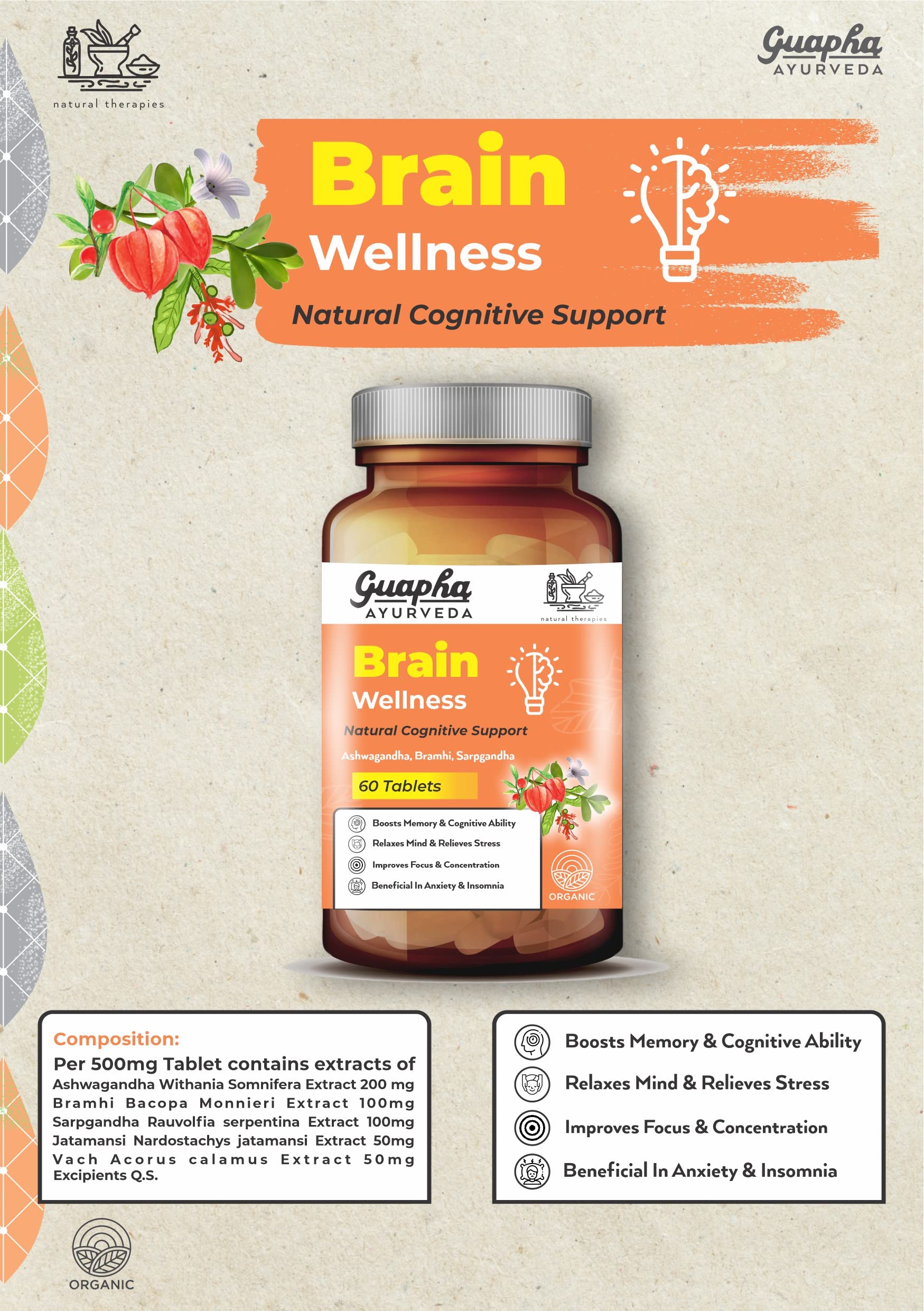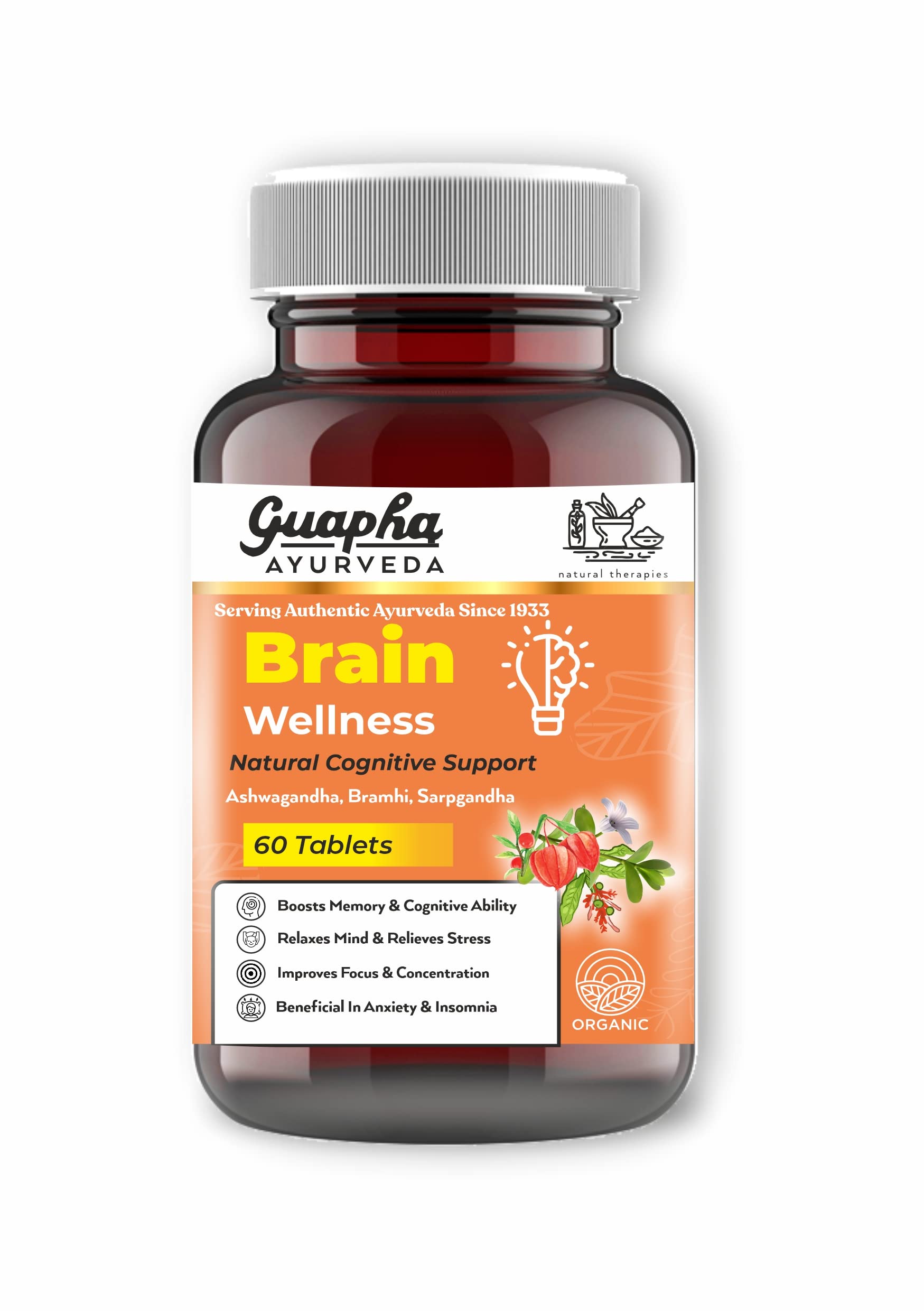 Guapha Ayurveda Brain Wellness | Natural Cognitive Support | Wth Herbal Extracts of Ashwagandha Bramhi Sarpgandha | 60 Tablets