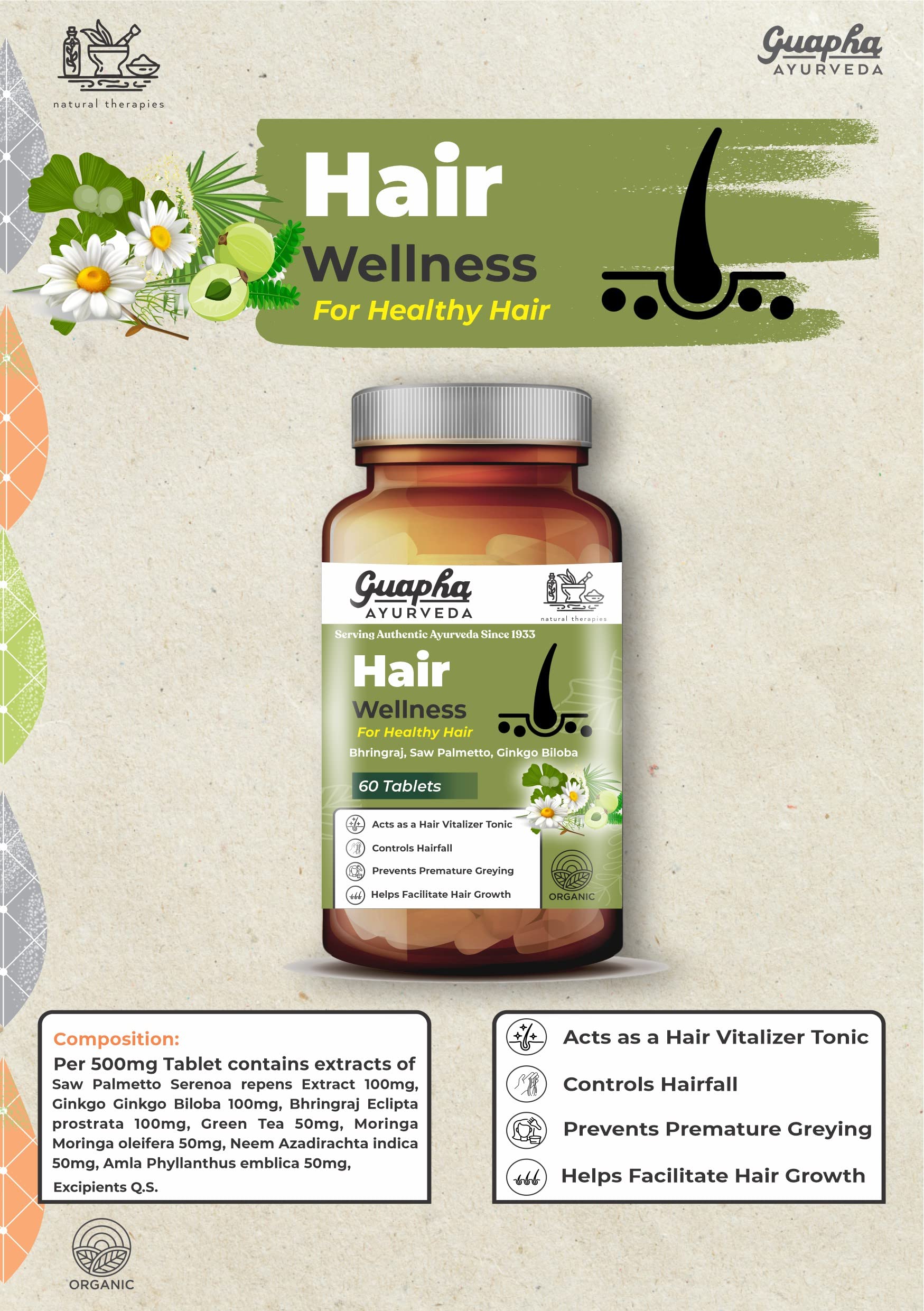 Guapha Ayurveda Hair Wellness Tablets | For Healthy Hair With Herbal Extracts Of Bhringraj Saw Palmetto Ginkgo Biloba Green Tea Moringa Neem Amla | 60 Tablets