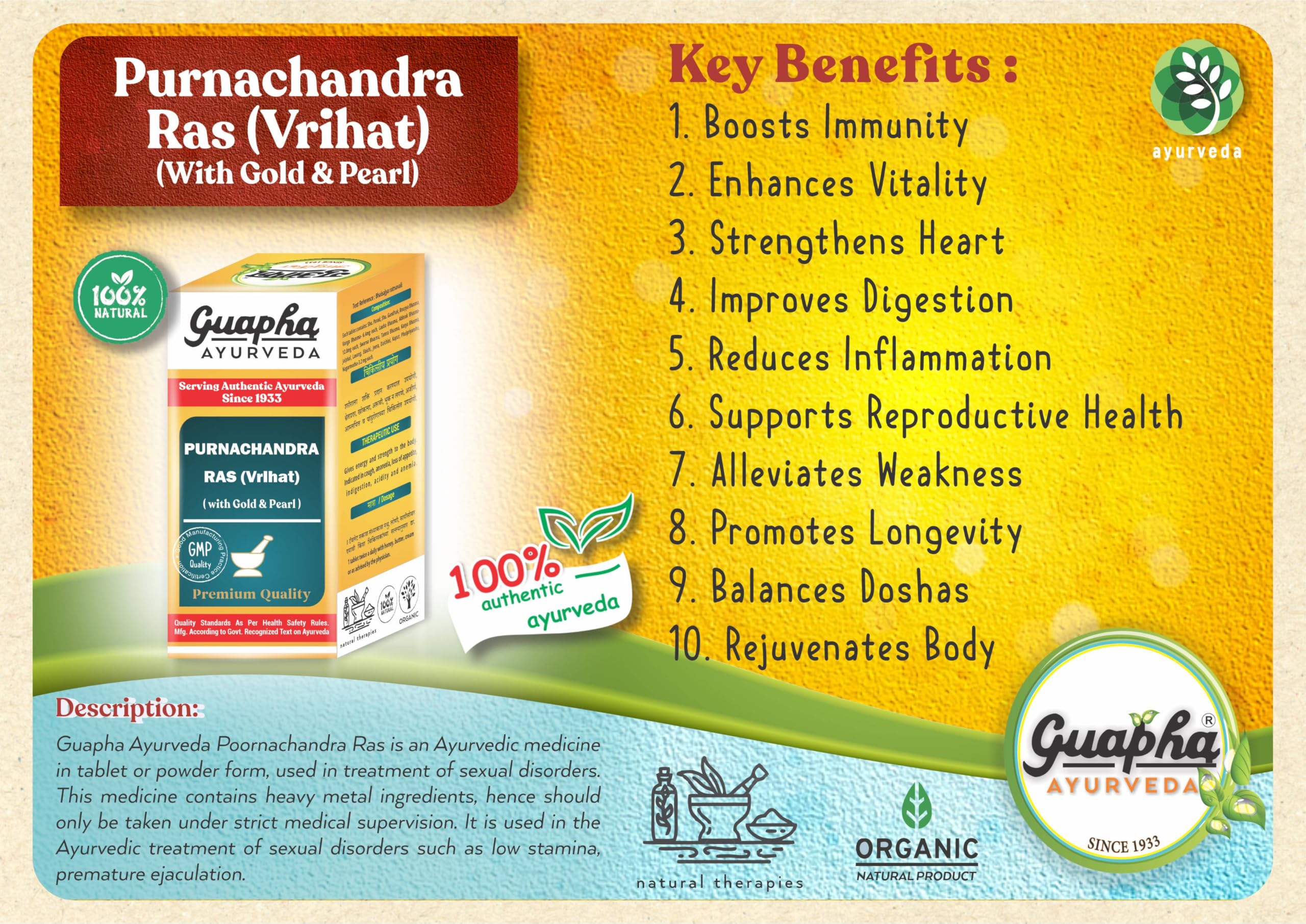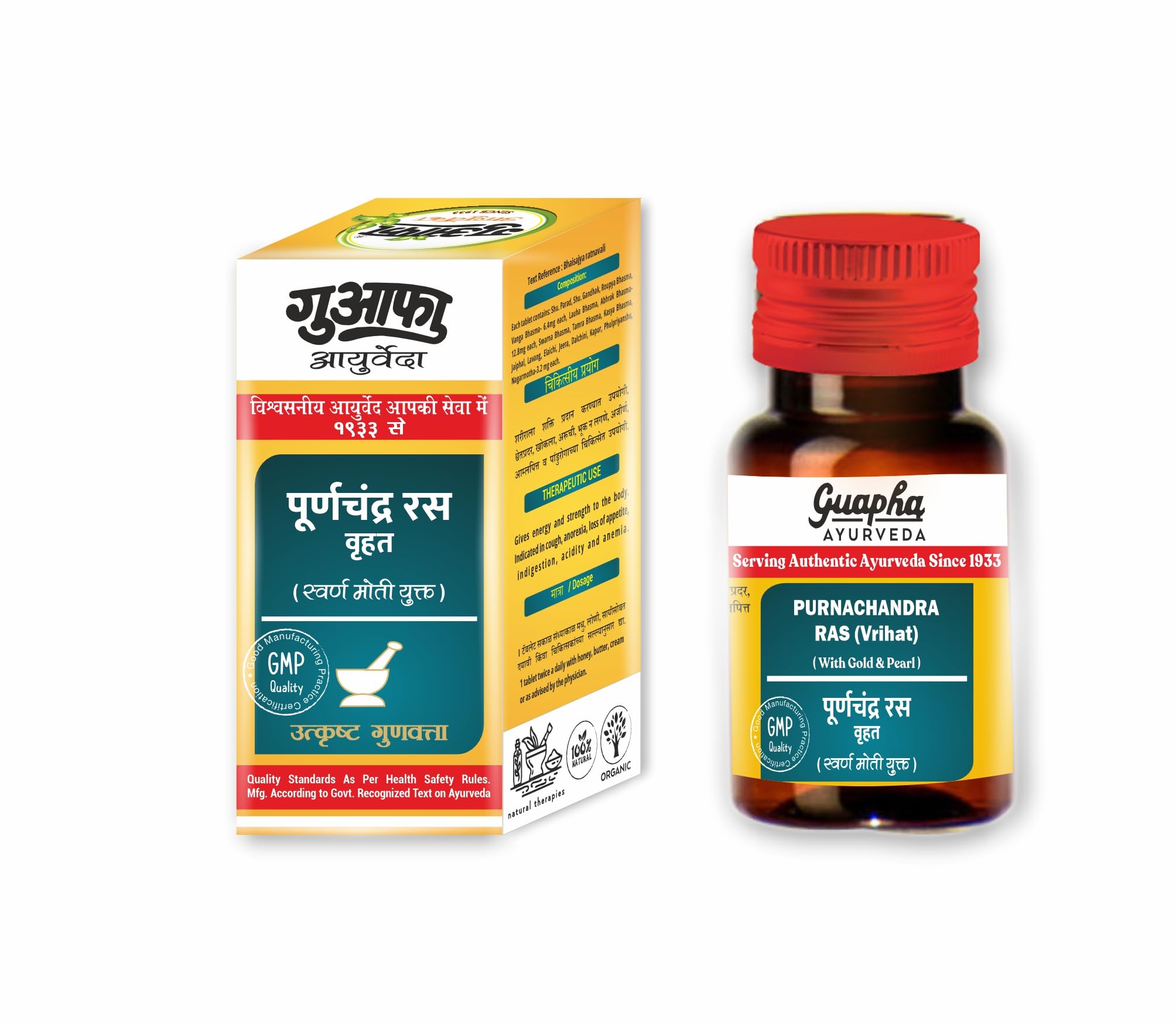 Guapha Ayurveda Puranchand Ras Vrihat (With Gold & Pearl) is a potent Ayurvedic formulation designed to enhance vitality and support immune health. Crafted with a blend of traditional herbs and minerals this tonic helps nourish the body boost energy levels and improve overall well-being. Ideal for combating fatigue and restoring strength Puranchand Ras works to balance doshas and promote healthy digestion. With ingredients like Shuddha Parad and Swarna Bhasma this formulation is effective in rejuvenating the body and supporting a robust immune response. Experience the transformative benefits of Puranchand Ras for a healthier more vibrant life through the wisdom of Ayurveda.
