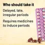 WHO SHOULD TAKE IT: Women facing delayed late irregular periods. Period gap exceeds 31 - 60 days or more. Don't get periods for 2-3 months. Scanty less period flow for less than 2-3 days. Unusual weight gain hormonal imbalance and consume homeopathy medic