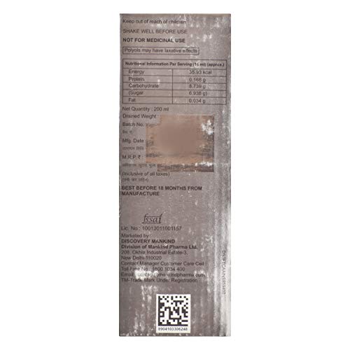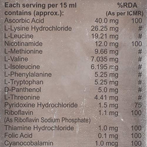 Composition: Each serving for 15 ml contains (approx): Ascorbic Acid 40.0mg. L-Lysine Hydrochloride 26.25mg. L-Leucine 19.21mg. Nicotinamide 12.0mg. L-Methionine 9.66mg. L-Valine 7.035mg. L-Isoleucine 6.195mg. L-Phenylalanine 5.25mg. L-Tryptophan 5.25mg. D-Panthenol 5.0mg. L-Threonine 4.41mg. Pyridoxine Hydrochloride 1.5mg. Riboflavin 1.1mg. (As Riboflavin Sodium Phosphate) Thiamine Hydrochloride 1.0mg. Folic Acid 0.1mg. Cyanocobalamin 1.0 mcg. # %RDA not established. Appropriate overages added to compensate for loss on storage. Ingredients: Sucrose Stabilizer (INS 420) Ascorbic Acid Acidity Regulator (INS 330) Preservative (INS 211) L-Lysine Hydrochloride L-Leucine Nicotinamide Thickener (INS 415) L-Methionine L-Valine L-Isoleucine L-Phenylalanine L-Tryptophan D-Panthenol L-Threonine Disodium Edetate Riboflavin Sodium Phosphate Pyridoxine Hydrochloride Thiamine Hydrochloride Folic Acid & Cyanocobalamin. Contains: Permitted natural food colour (ins 150a) and added flavours (nature-identical chocolate & mixed fruit flavouring substances).
