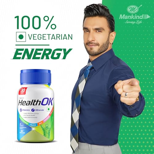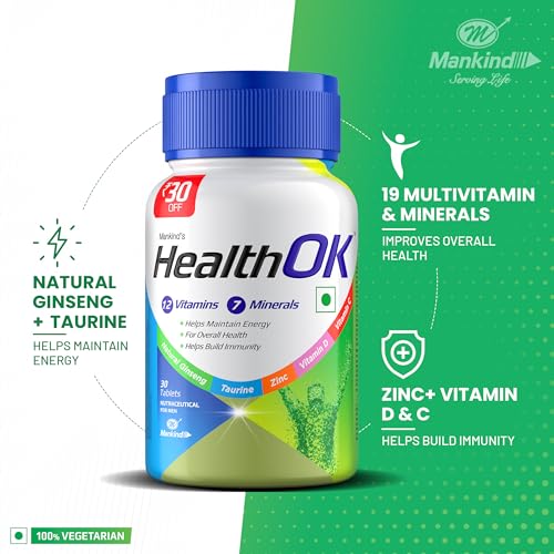 Introducing 100% vegetarian HealthOK your daily source to stay energetic & fit. HealthOK is a multivitamin tablet designed to boost your energy levels and help you tackle the demands of the day with ease. This 100% vegetarian tablet has been especially formulated to provide you with 24-hour active energy & to improve immunity and overall health.Packed with a powerful blend of Natural Ginseng Taurine Power and 19 vitamins and minerals HealthOK tablets goes beyond the ordinary. The inclusion of natural ingredients like Ginseng and Taurine helps boosting energy levels and promoting overall well-being. Not just an energy booster HealthOK also contributes to your overall health and immunity.By incorporating just one tablet of 100% vegetarian HealthOK into your daily routine you can experience an increase in your energy levels required to excel in both professional and personal tasks. Whether it's a busy workday hitting the gym or managing household responsibilities HealthOK helps you live a balanced life without compromising on your well-being. It also has a refreshing lemon flavour that adds a zesty twist to your daily routine.Choose HealthOK â the multivitamin tablet that not only meets your daily energy requirements but also promotes improved overall health and immunity. Turn on screen reader support