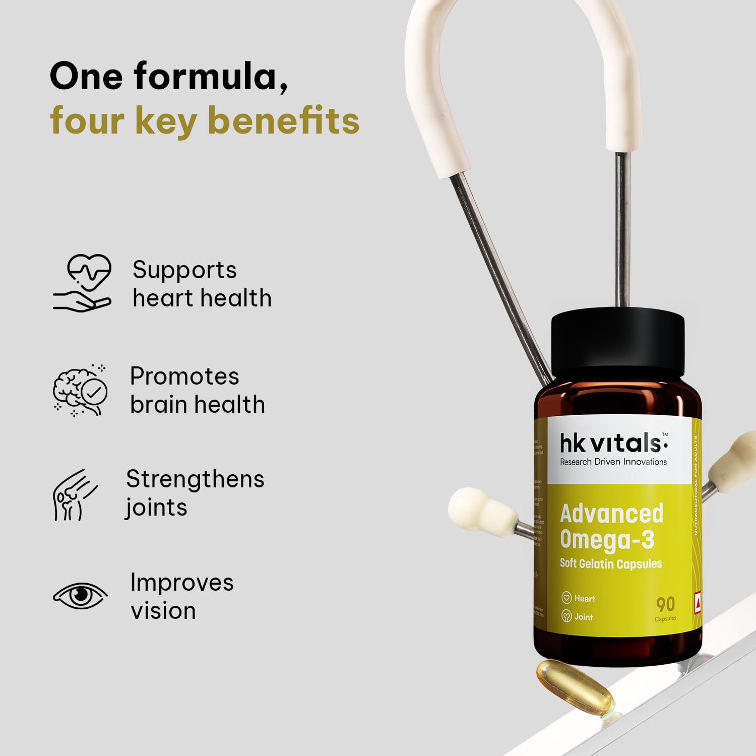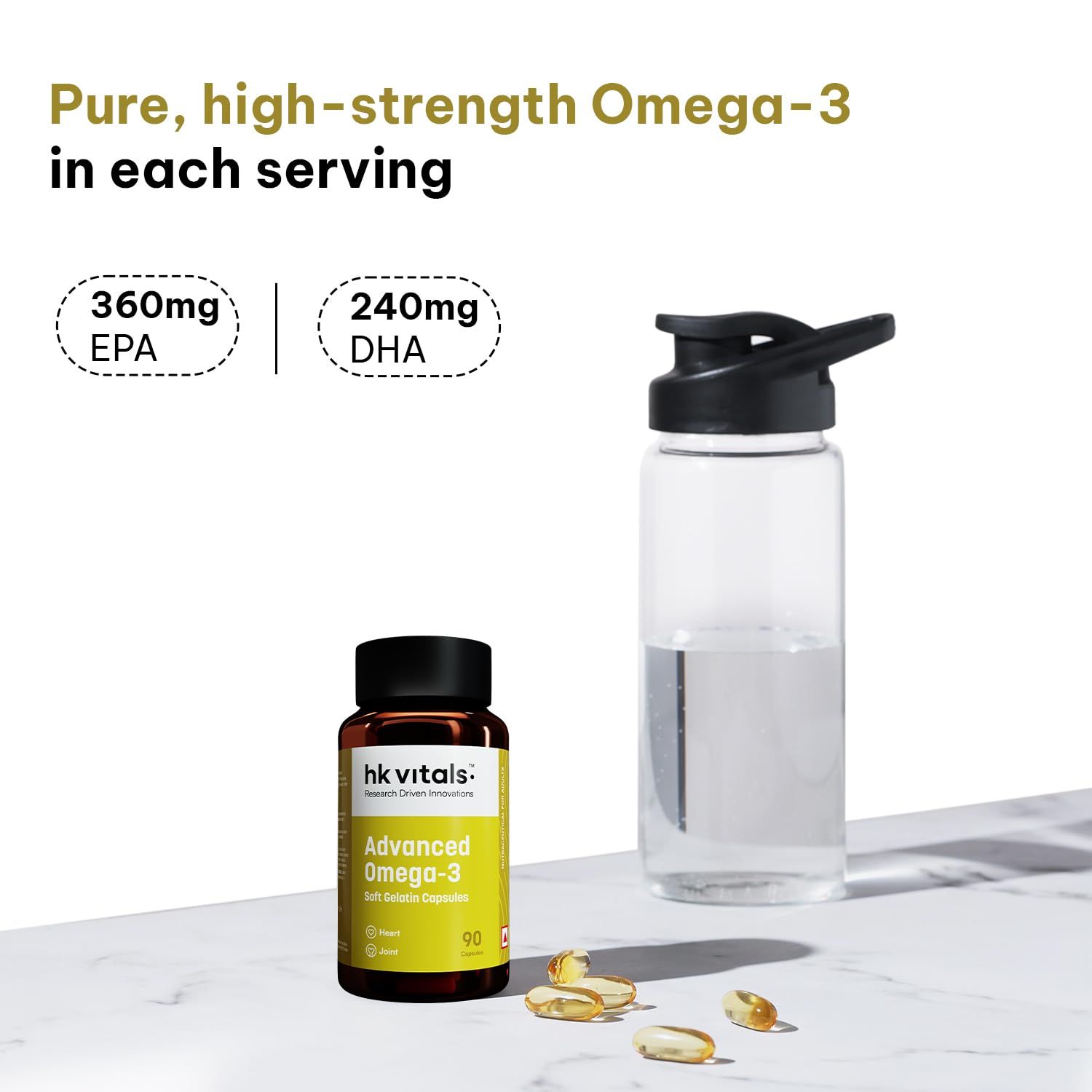AN ADVANCED DOUBLE STRENGTH OMEGA-3: HealthKart HK Vitals Advanced Omega 3 has a higher concentration of beneficial Omega-3s (360 mg EPA & 240 mg DHA) thus making it a much more potent formulation for individuals seeking to optimize their health