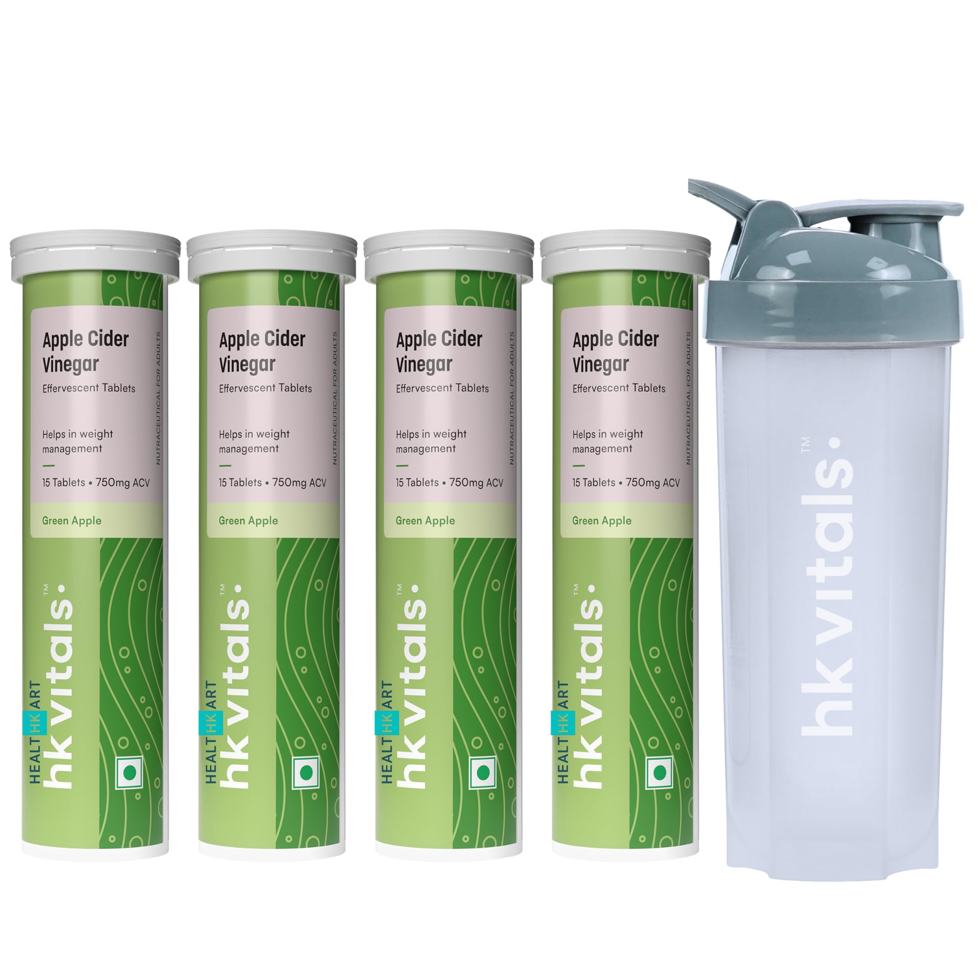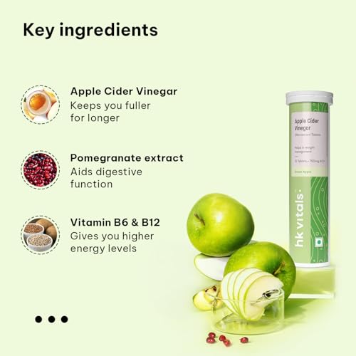 Sparkling health in a tablet- the fizzlicious way to consume apple cider vinegar! HealthKart HK Vitals Apple Cider Vinegar is Indiaâs first 750 mg apple cider vinegar tablet which is effervescent; Available in tasty green apple & watermelon flavours. HK Vitals Apple Cider Vinegar promotes weight management by keeping you full for longer. Apple cider vinegar tablet has natural acidic properties that help balance stomach acids reducing bloating and gas and improving digestion. Apple Cider Vinegar contains acetic acid which increases the activity of enzymes that improve our metabolism so our body burns calories faster. Apple Cider Vinegar is also enriched with Vitamin B6 & B12 to help fat mobilization & energy production while pomegranate extract helps boost immunity. It has no added sugar or preservatives & is 100% vegetarian. Get HealthKart HK Vitals ProteinUp Shaker Bottle of 600 ml capacity for easy mixability with apple cider vinegar effervescent tablets. To minimise messy spills it has a wide-mouth bottle cap that is secured with a tight screw on top